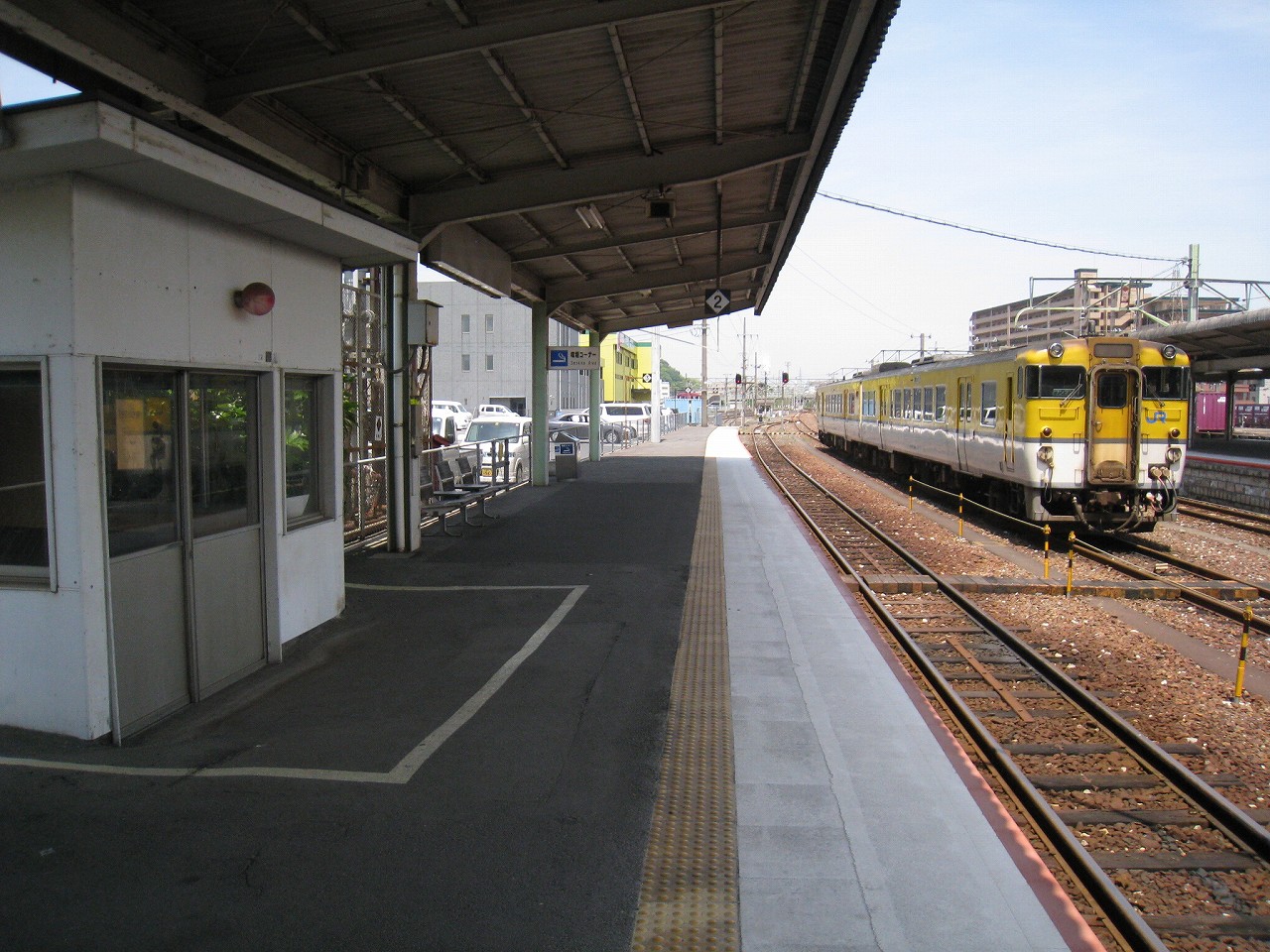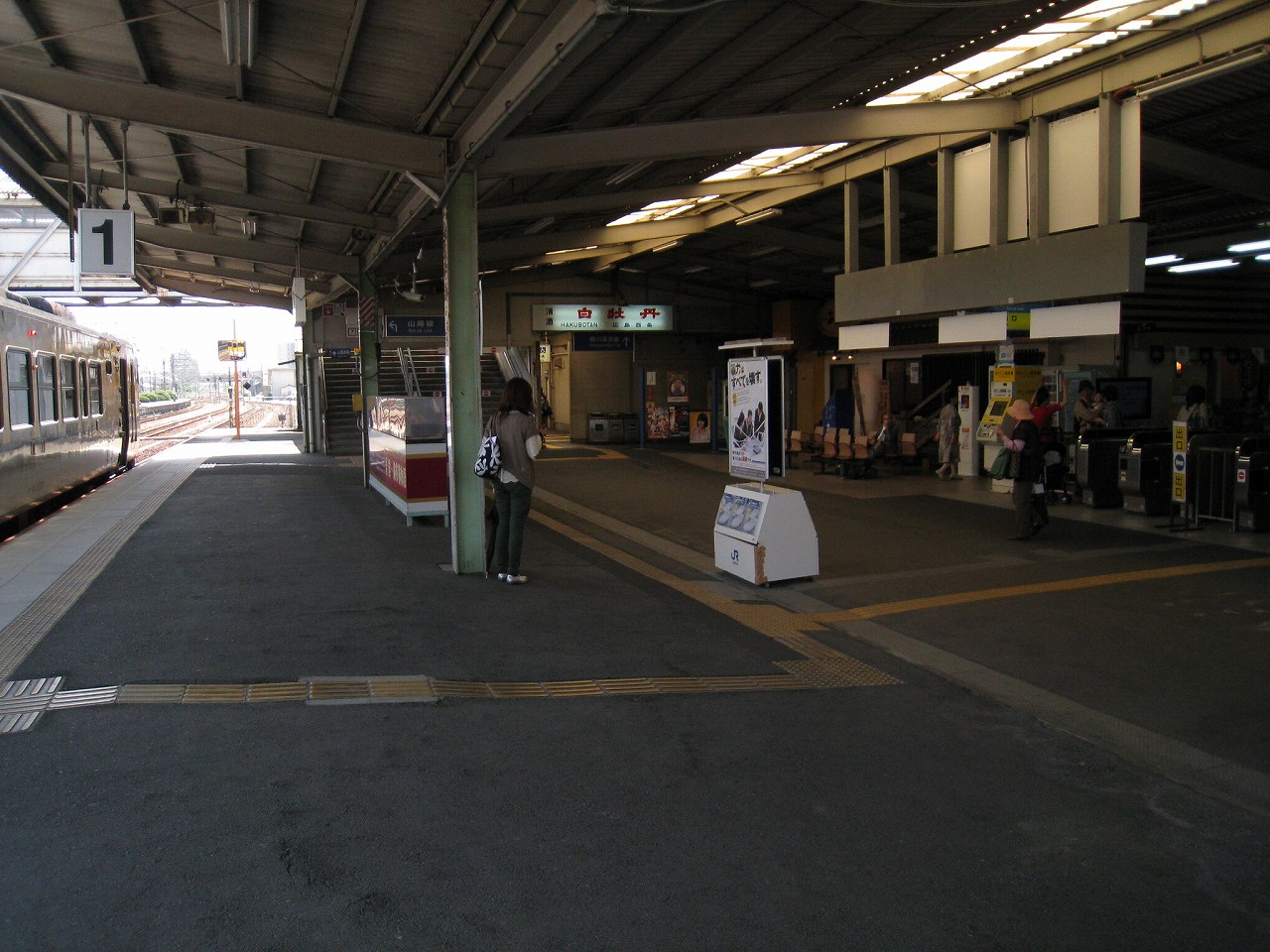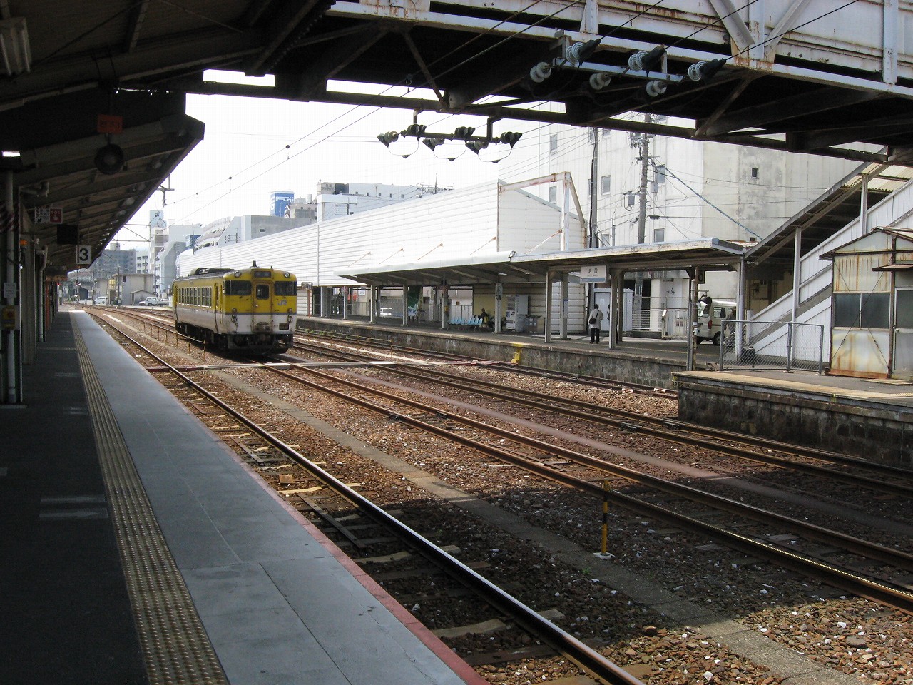 改札のある1番線。大屋根の下は日陰だが、ホームの縁まで出て遠くを眺めやると、薫風が目を乾かし、遠くのホームの植え込みの緑さえも鮮やかに見えた。しだいにそのホームに人が集まり始めた。岩徳線の列車が入ってくるのだ。多くの人は立ったままだが、何人かは地べたに座って列車を待っていて、そのうち一人の男性は、サングラスをかけ、ずっと故郷の唄を吟じていた。怖い人だと思った。けれど私がそうして遠くに目を凝らしていると、その人は唄をやめて、