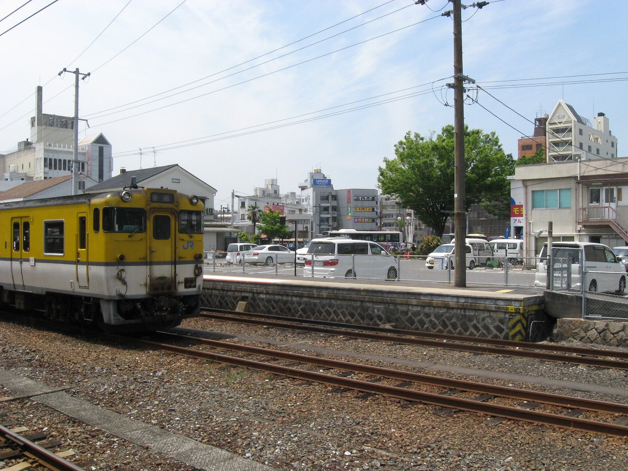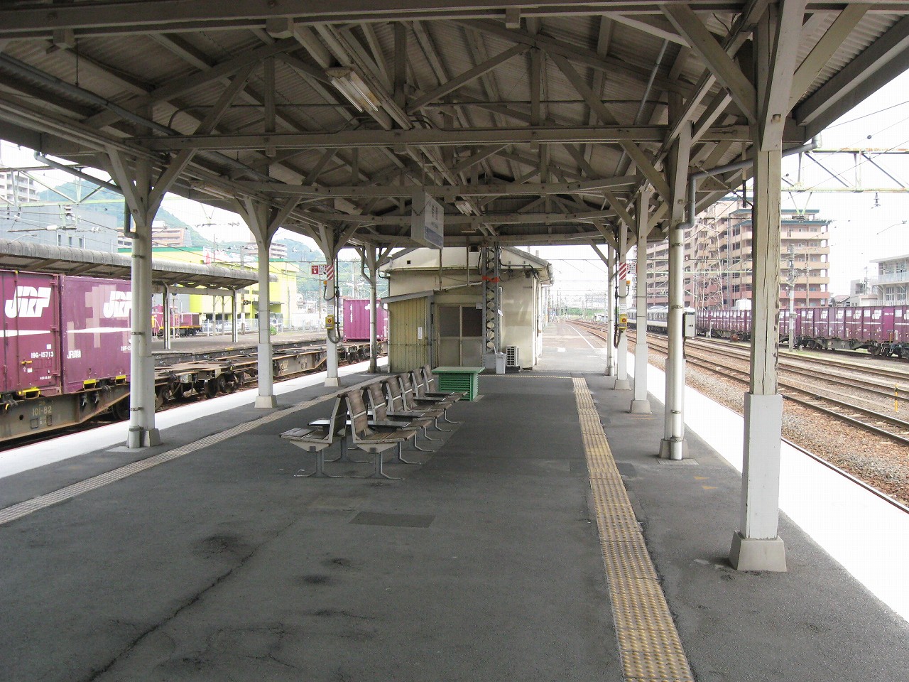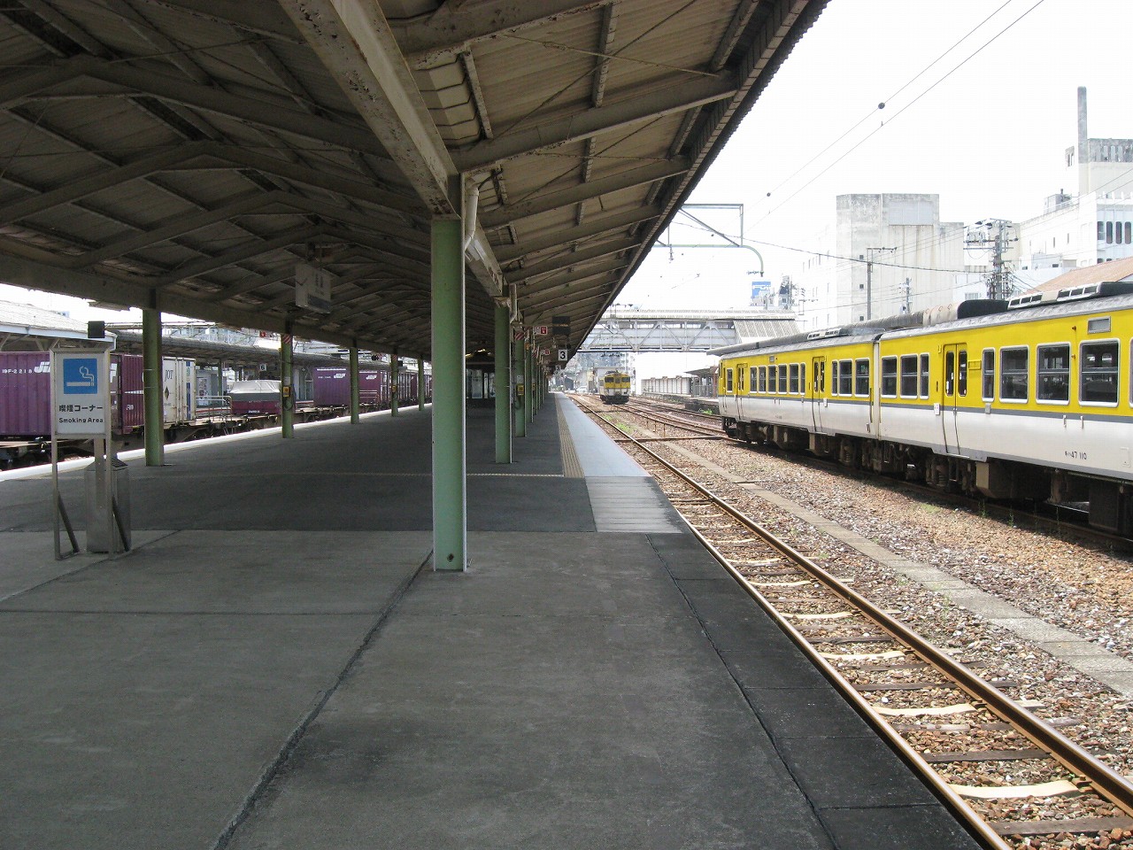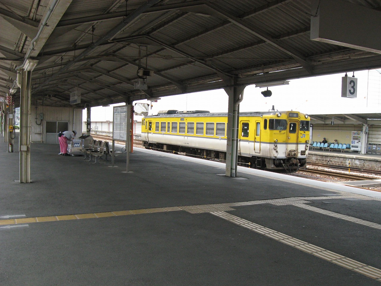 改札のある1番線。大屋根の下は日陰だが、ホームの縁まで出て遠くを眺めやると、薫風が目を乾かし、遠くのホームの植え込みの緑さえも鮮やかに見えた。しだいにそのホームに人が集まり始めた。岩徳線の列車が入ってくるのだ。多くの人は立ったままだが、何人かは地べたに座って列車を待っていて、そのうち一人の男性は、サングラスをかけ、ずっと故郷の唄を吟じていた。怖い人だと思った。けれど私がそうして遠くに目を凝らしていると、その人は唄をやめて、