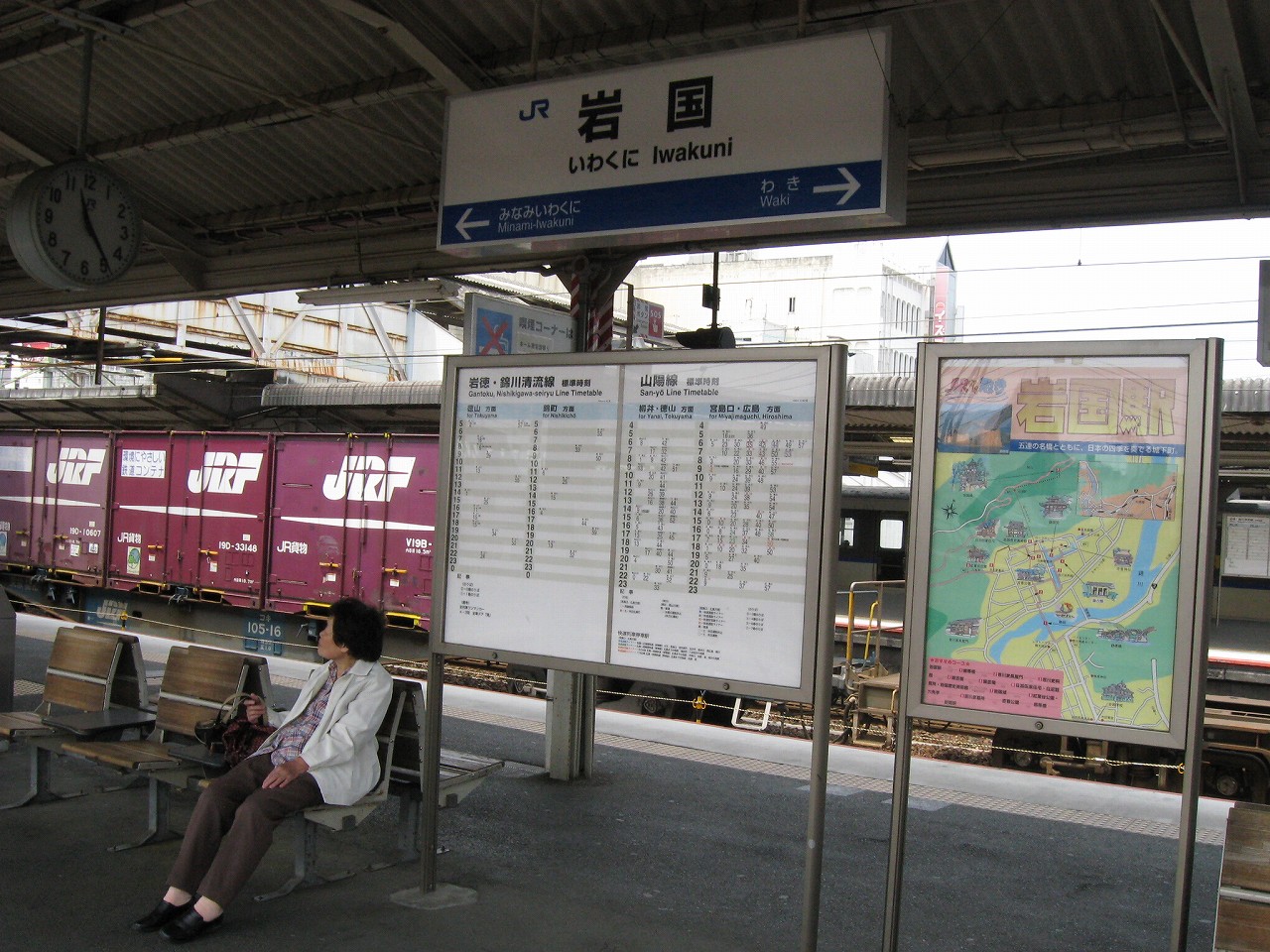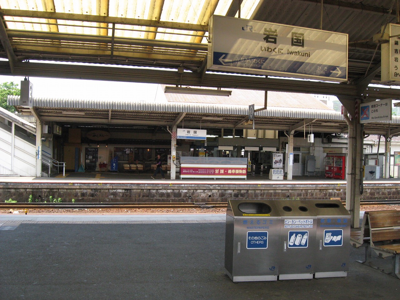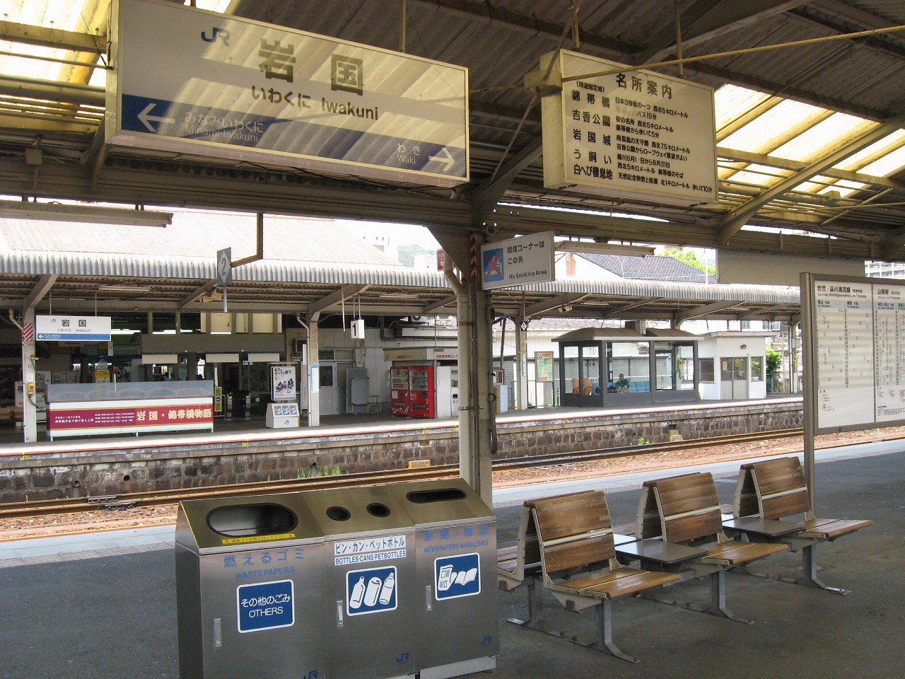 ボロボロの車内でガタピシ揺られながら、煙突からの煙か薄曇りのせいでモヤがかかったような操車場や工場地帯を見つつ、錦川清流線の案内や、それから「岩徳線、玖珂方面、お時間少々空きまして…」と、1時間の列車を案内するのを聞きつつ、「本日もJR西日本をご利用くださいましてまことにありがとうございました、岩国、岩国です」と締めくくられるのを聞くと、山口に入ったなぁと思うことしきりだった。長い芸州を抜けてきたのだ。