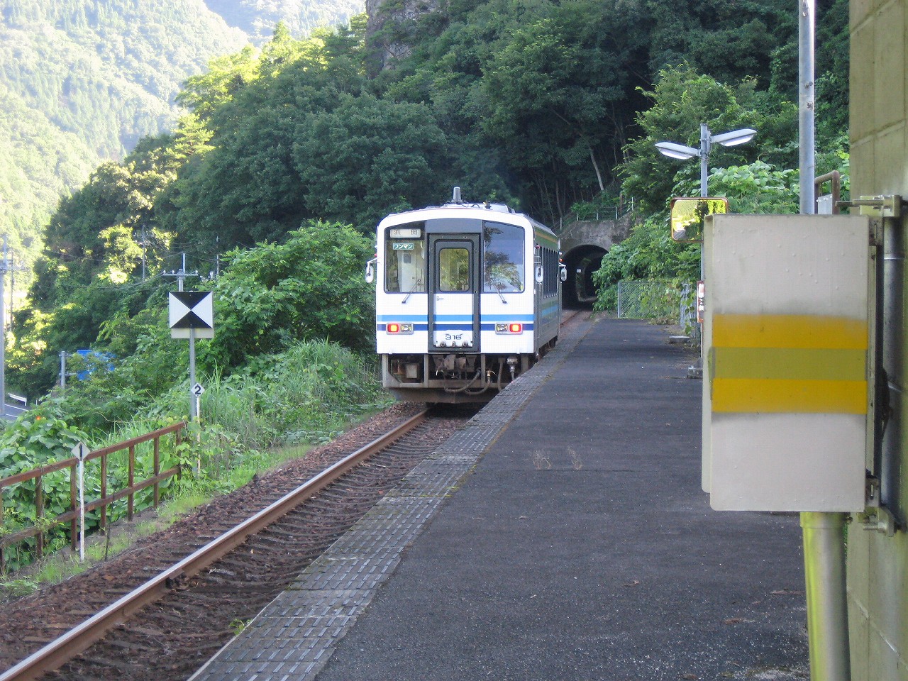 こういう山影にひっそりと、ブロック積みの待合室しかないそんな駅に焦がれて来た。もはや僕は木造舎を求めるのではなく、それが作れなくなった時代の駅にも、その幻影を感得するまでに至っているかもしれない。