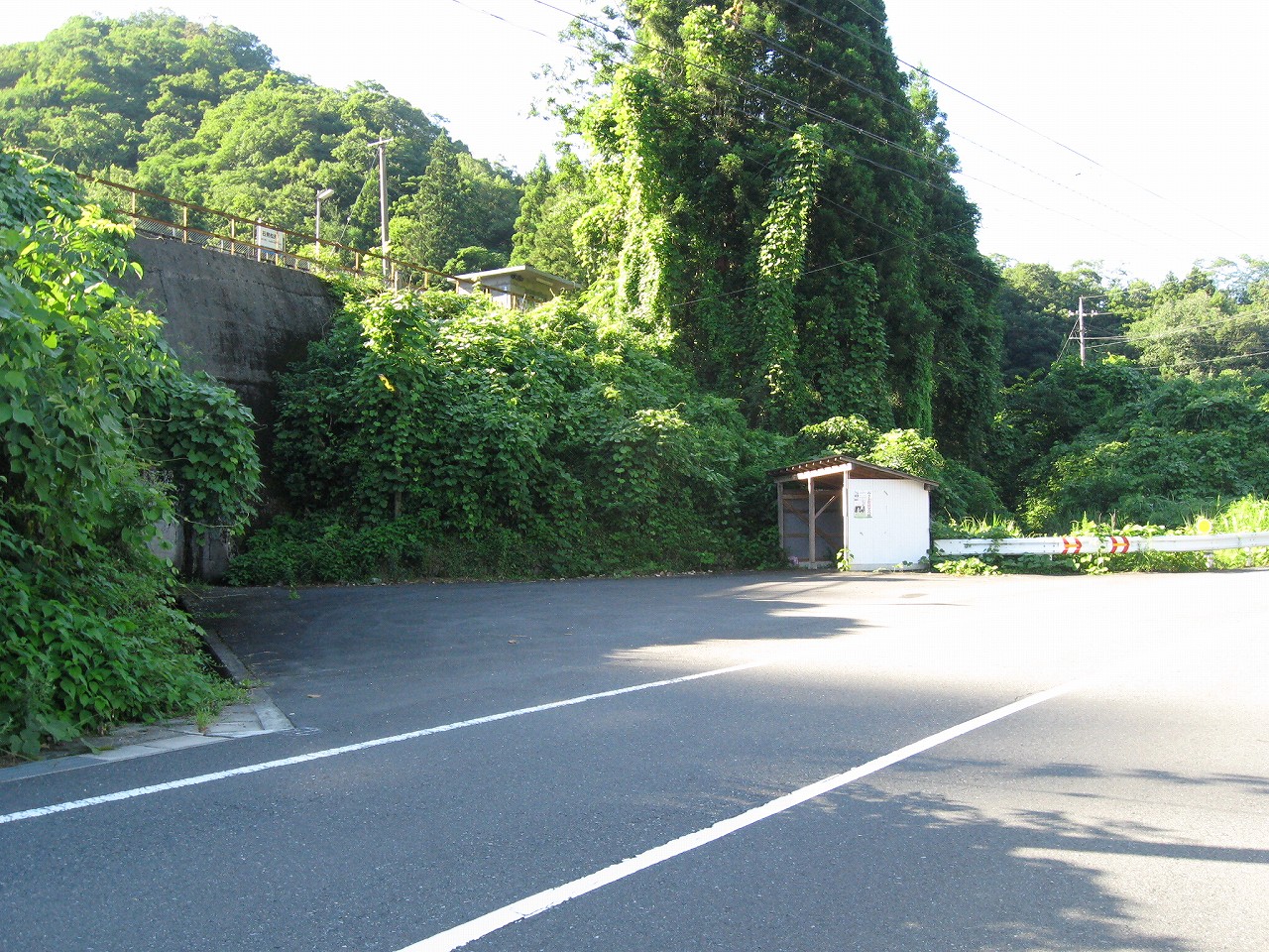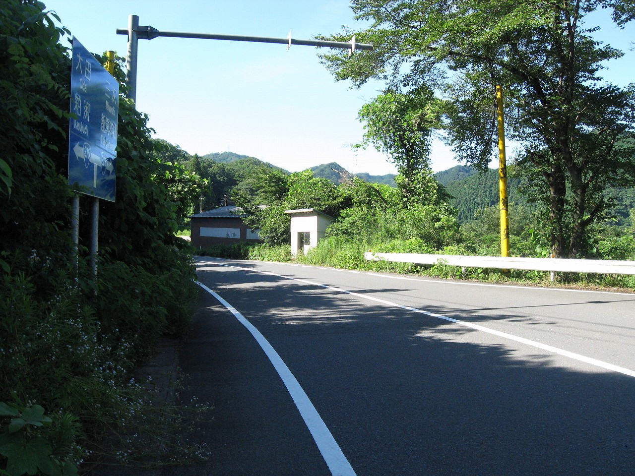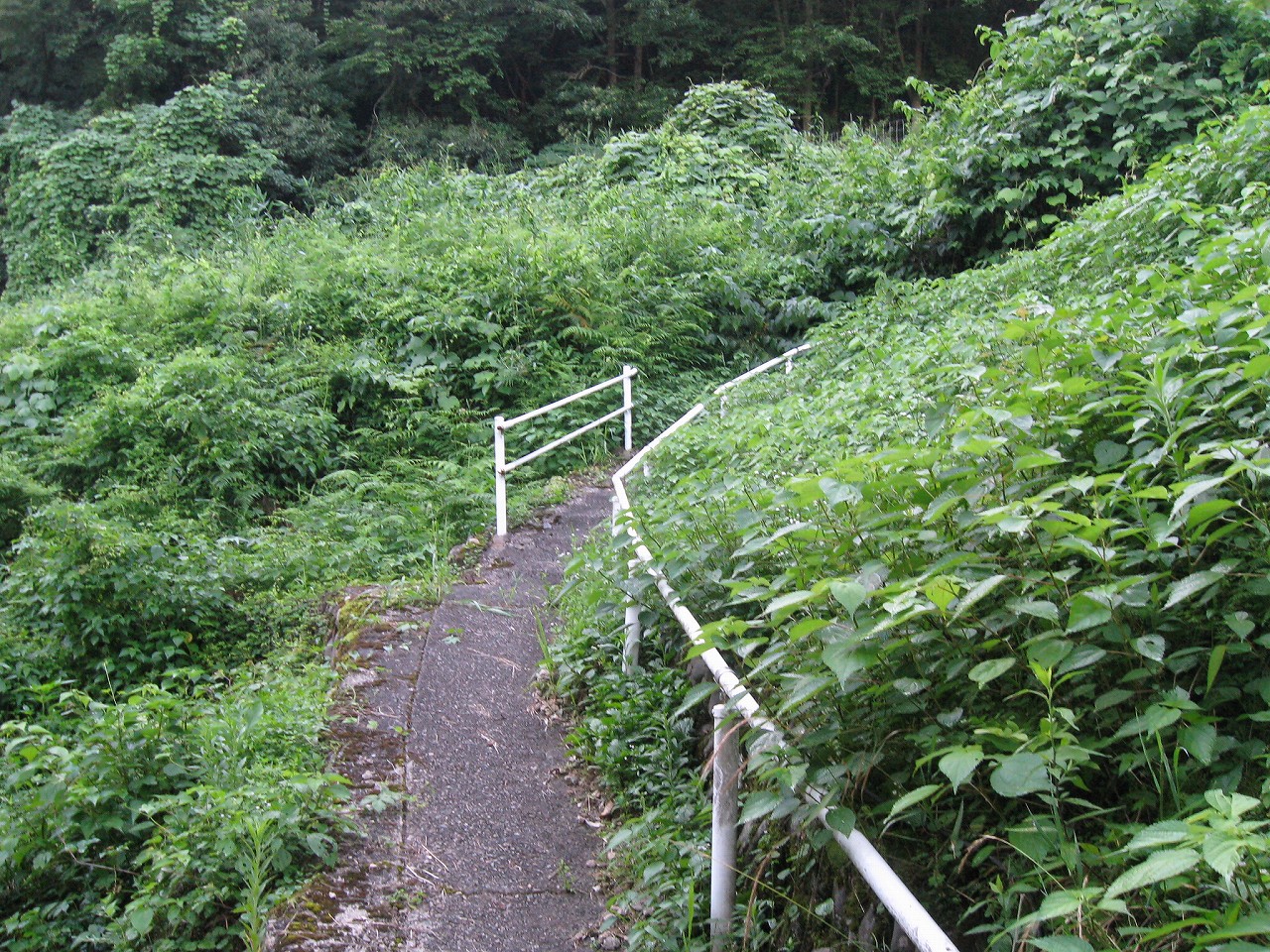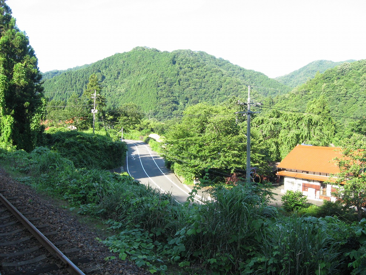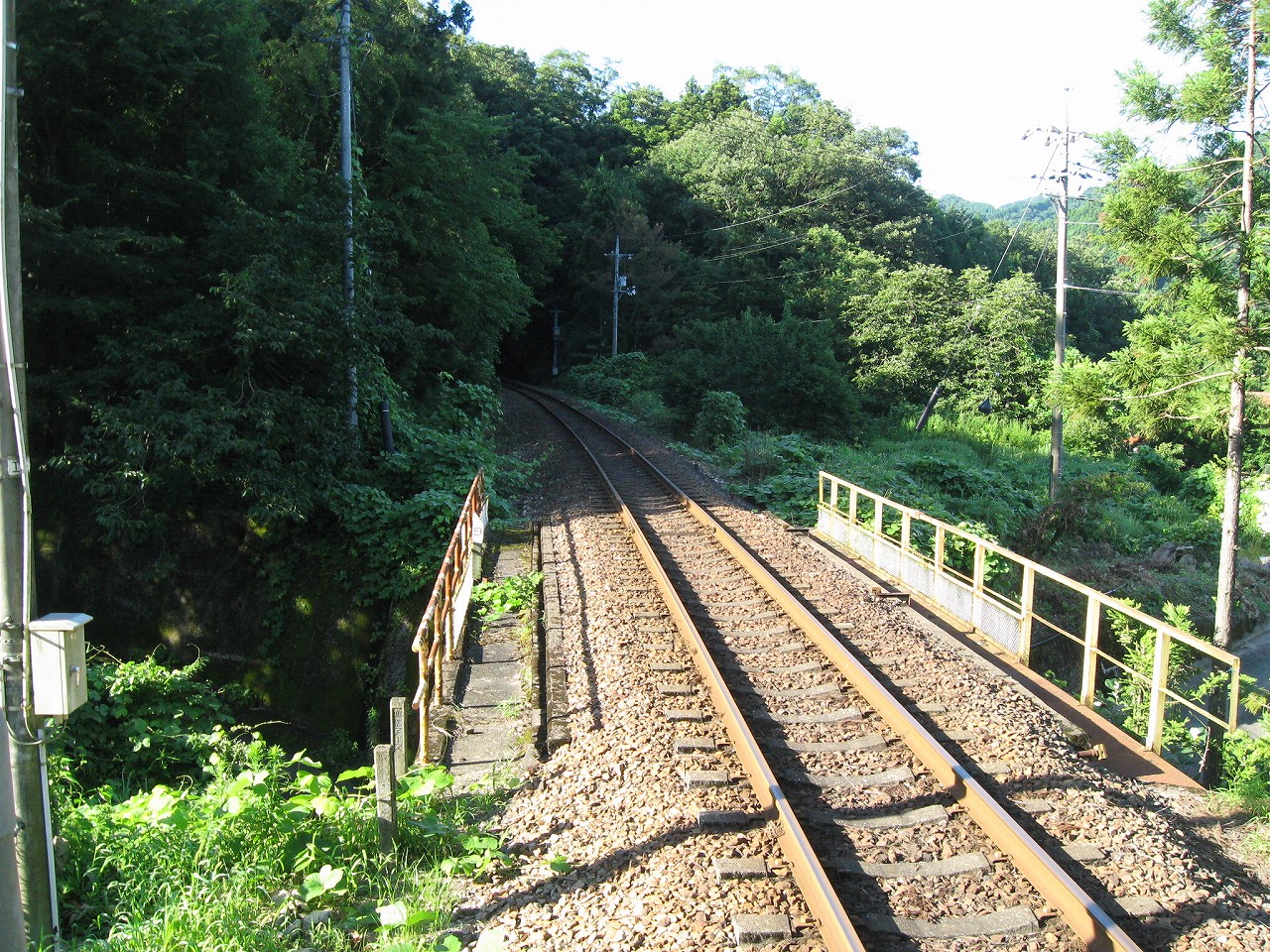 そんな感じだからホーム降りたところには人家などなく、どこからか道を下りて行って、眼下に見えていた川沿の県道に降りると思えた。遠くの山の上ばっかりが照って、ここはずーんと重い日陰という何とも寂しげなところだが、バスの時間もあるし、まずこの駅から脱出しないといけない。しかしその方法がよくわからない。案内板はいっさいないし、ちょうど人の幅しかない、緑の海を縫う道しかないのだ。車の幅の道もあったが、なんとなく遠回りな気がして、パスした。