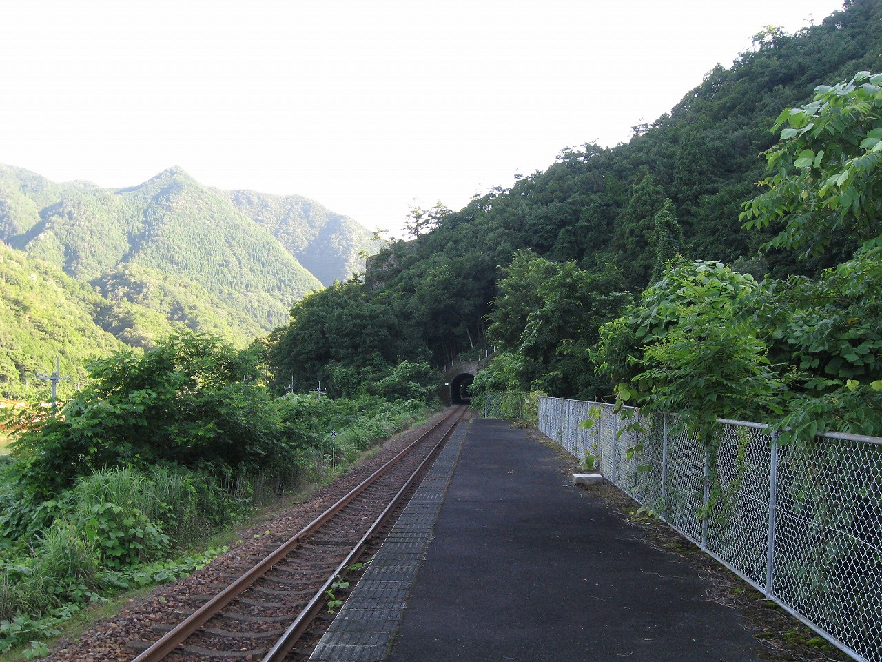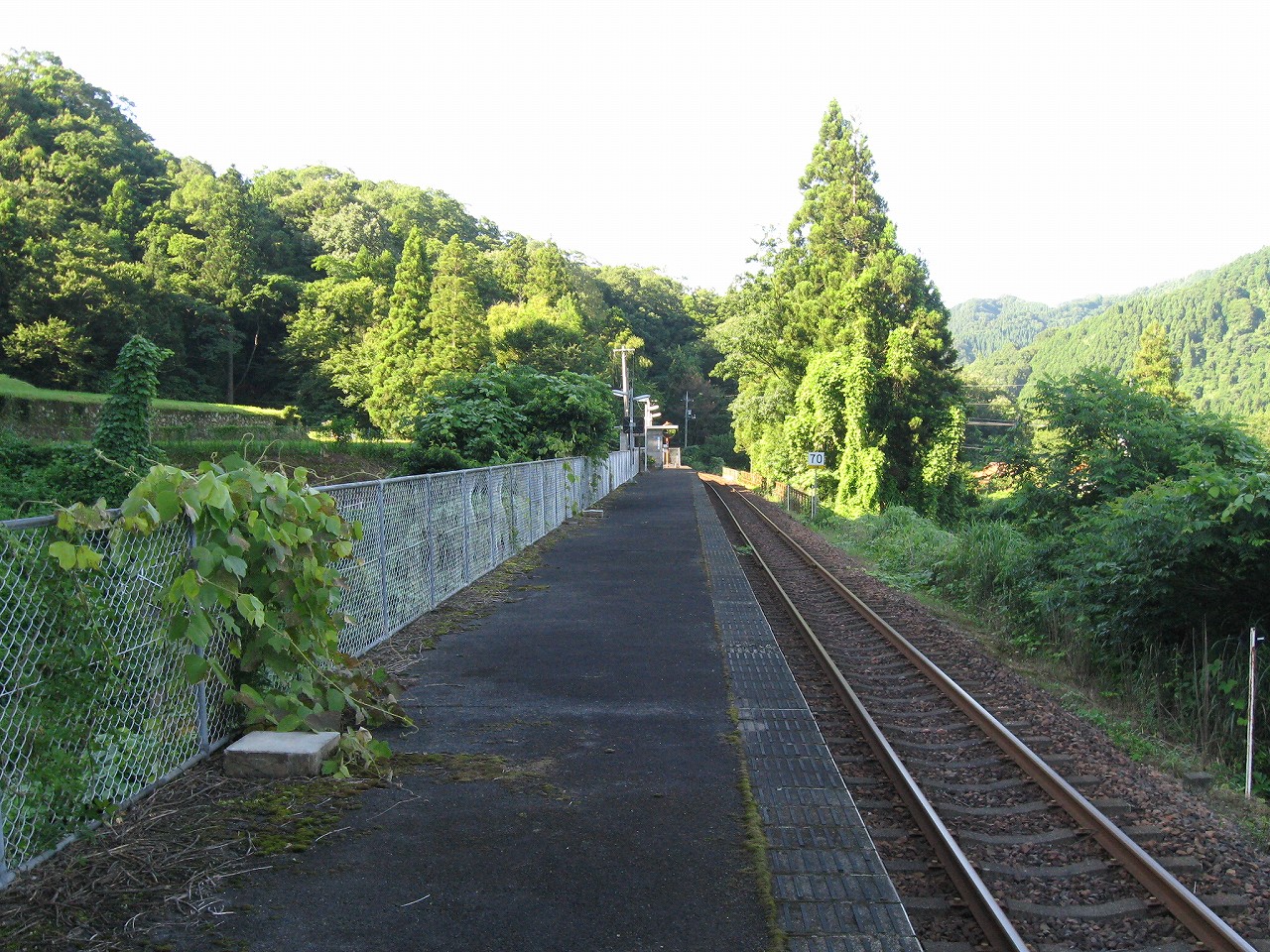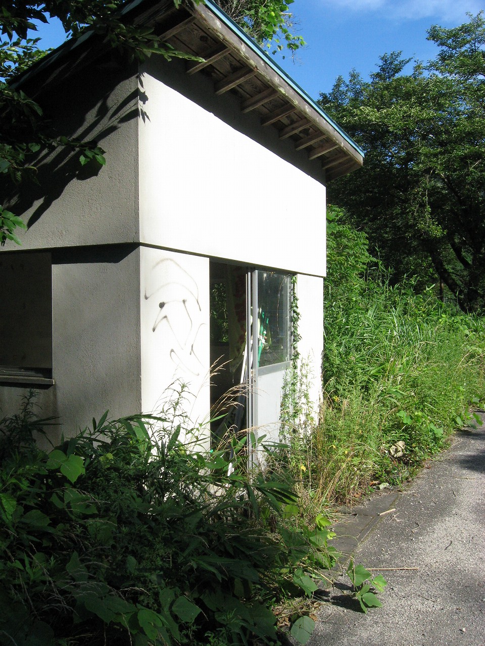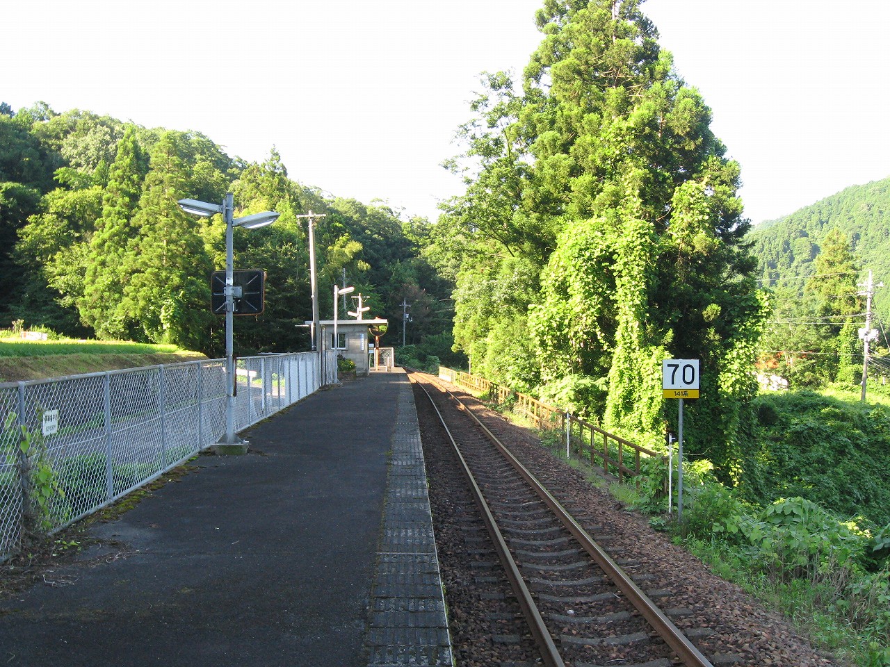 そんな感じだからホーム降りたところには人家などなく、どこからか道を下りて行って、眼下に見えていた川沿の県道に降りると思えた。遠くの山の上ばっかりが照って、ここはずーんと重い日陰という何とも寂しげなところだが、バスの時間もあるし、まずこの駅から脱出しないといけない。しかしその方法がよくわからない。案内板はいっさいないし、ちょうど人の幅しかない、緑の海を縫う道しかないのだ。車の幅の道もあったが、なんとなく遠回りな気がして、パスした。
