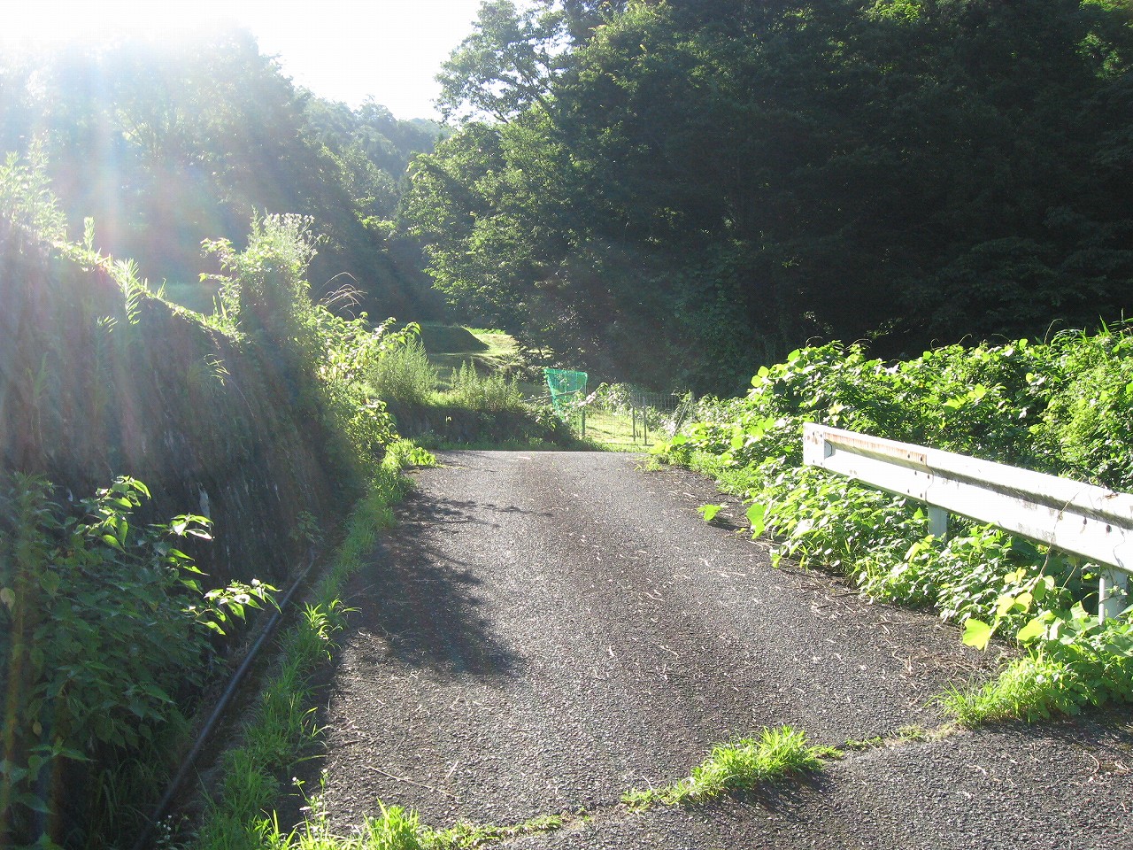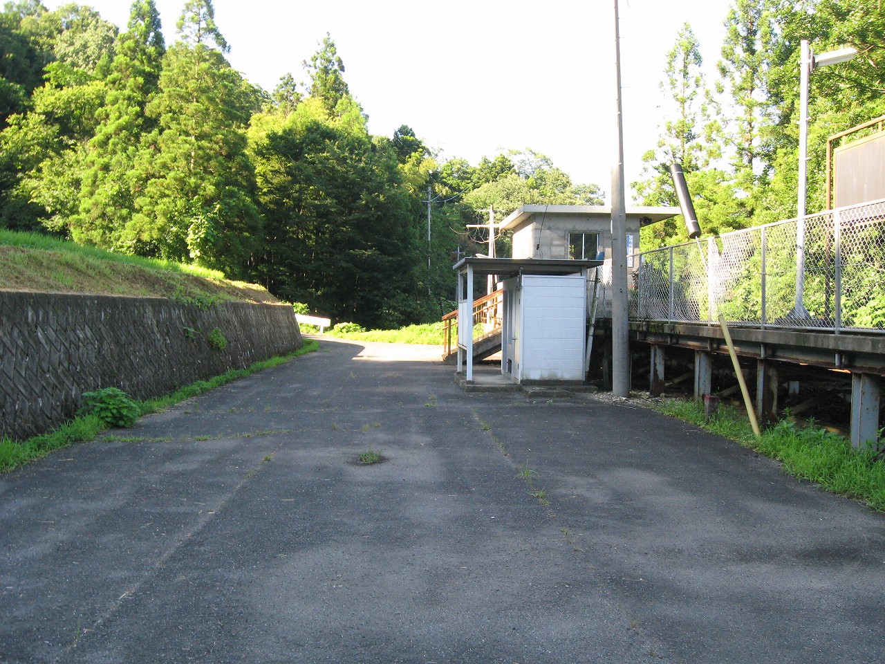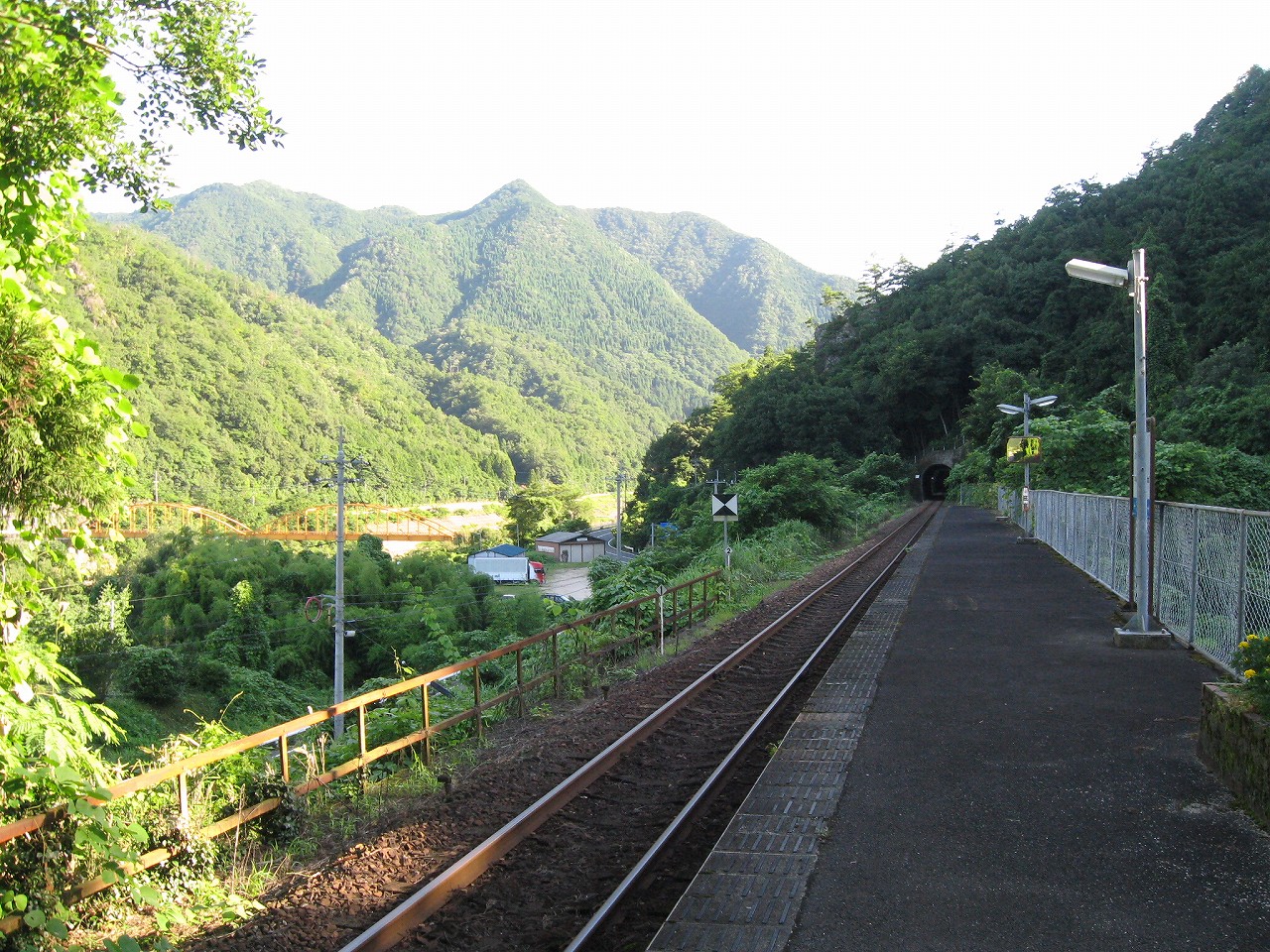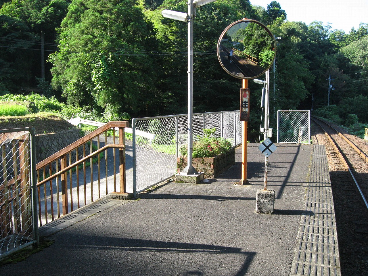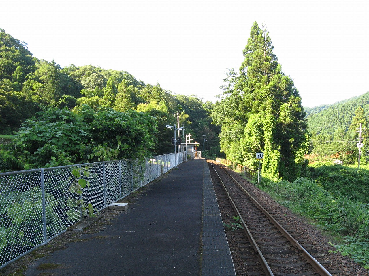 そんな感じだからホーム降りたところには人家などなく、どこからか道を下りて行って、眼下に見えていた川沿の県道に降りると思えた。遠くの山の上ばっかりが照って、ここはずーんと重い日陰という何とも寂しげなところだが、バスの時間もあるし、まずこの駅から脱出しないといけない。しかしその方法がよくわからない。案内板はいっさいないし、ちょうど人の幅しかない、緑の海を縫う道しかないのだ。車の幅の道もあったが、なんとなく遠回りな気がして、パスした。