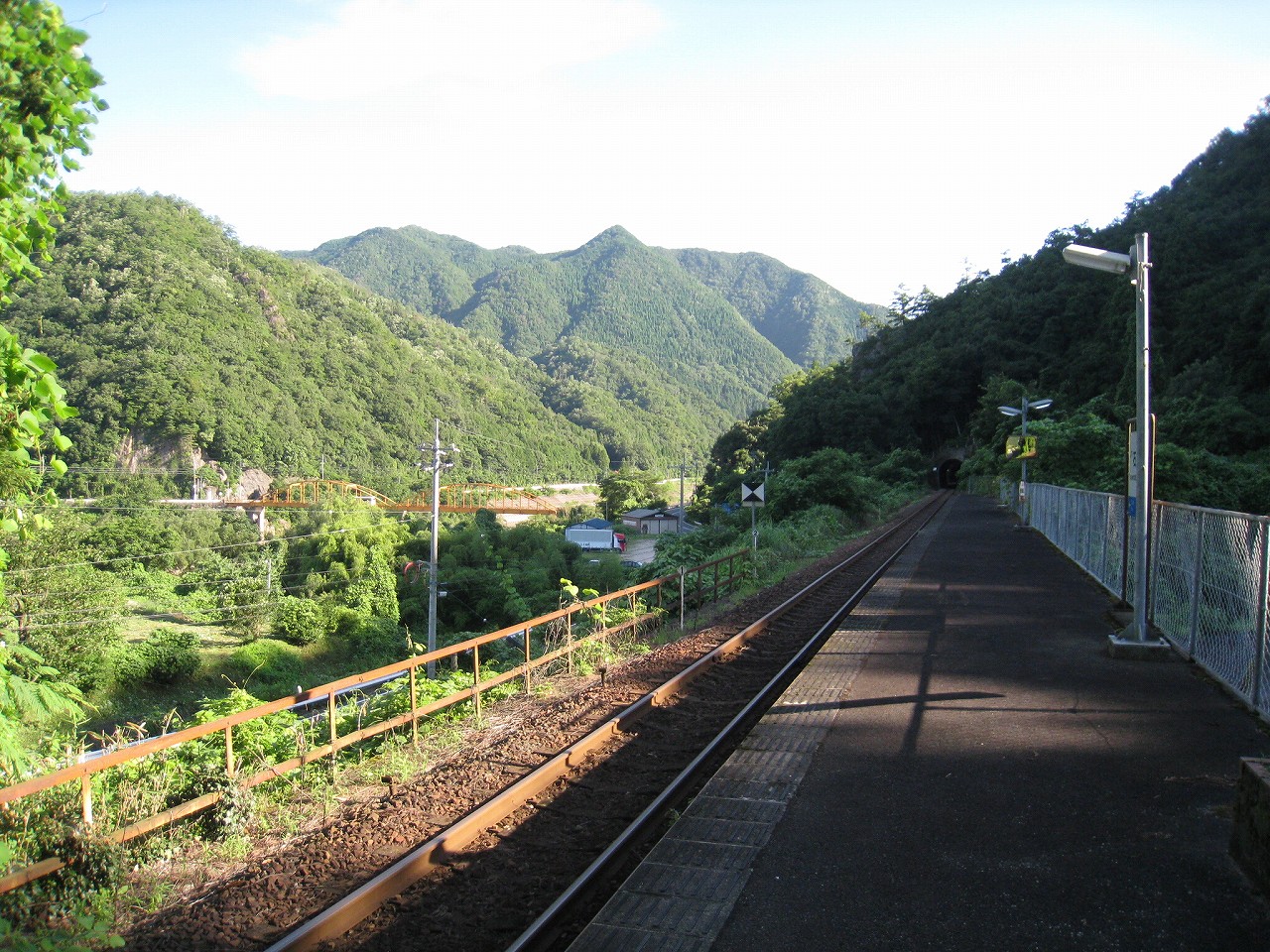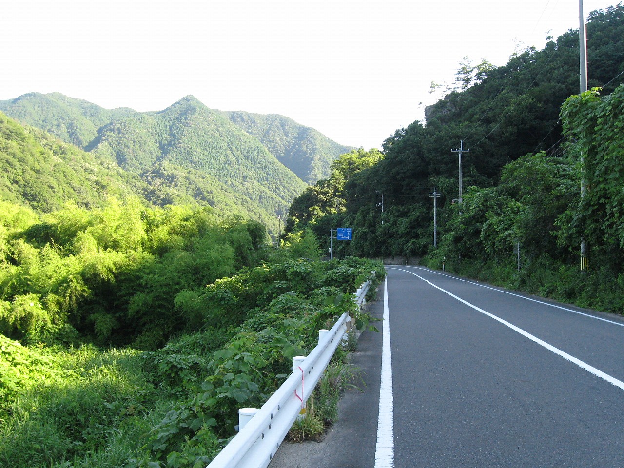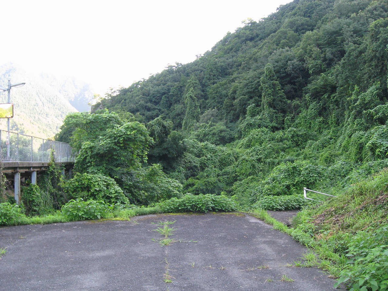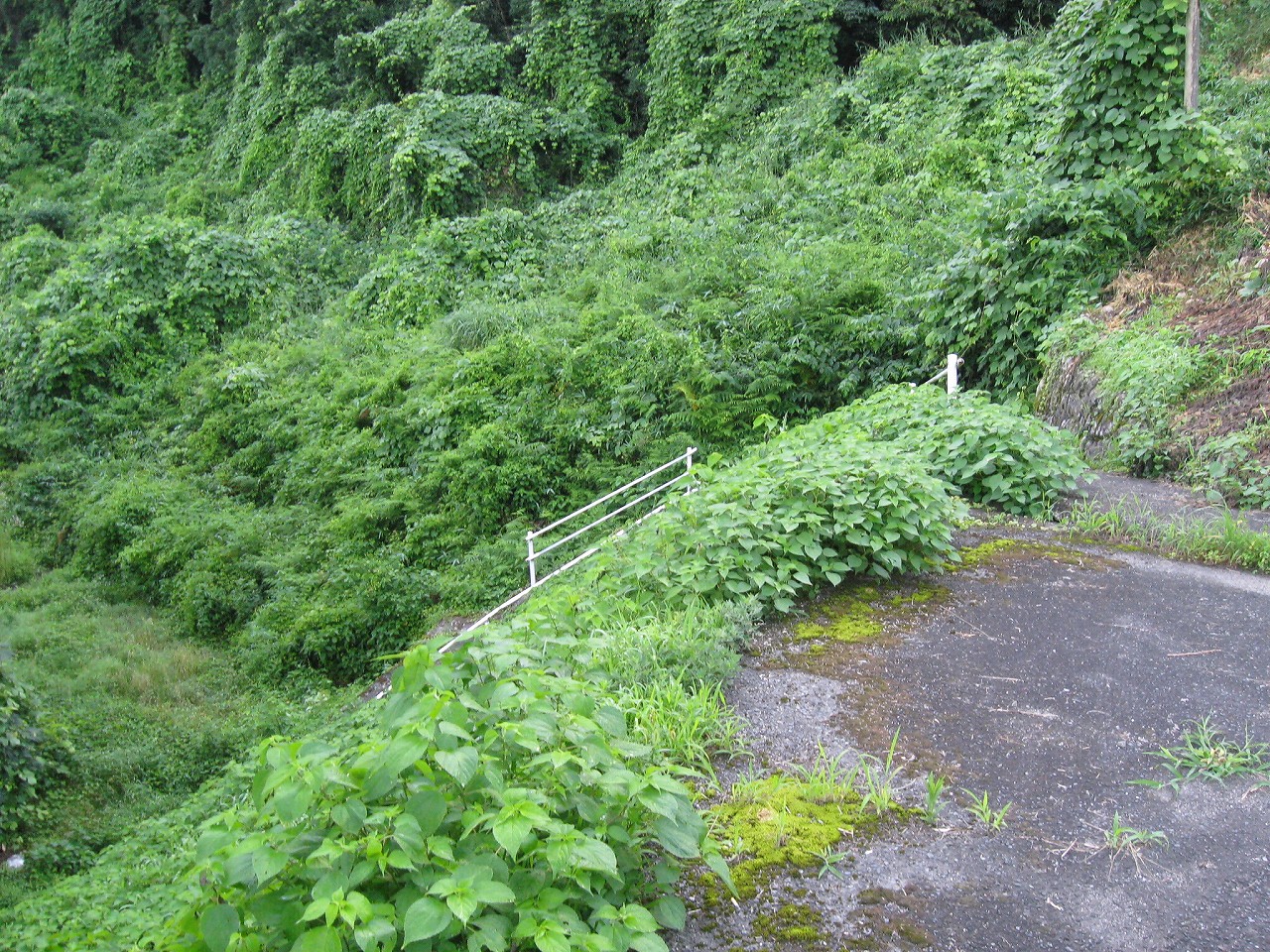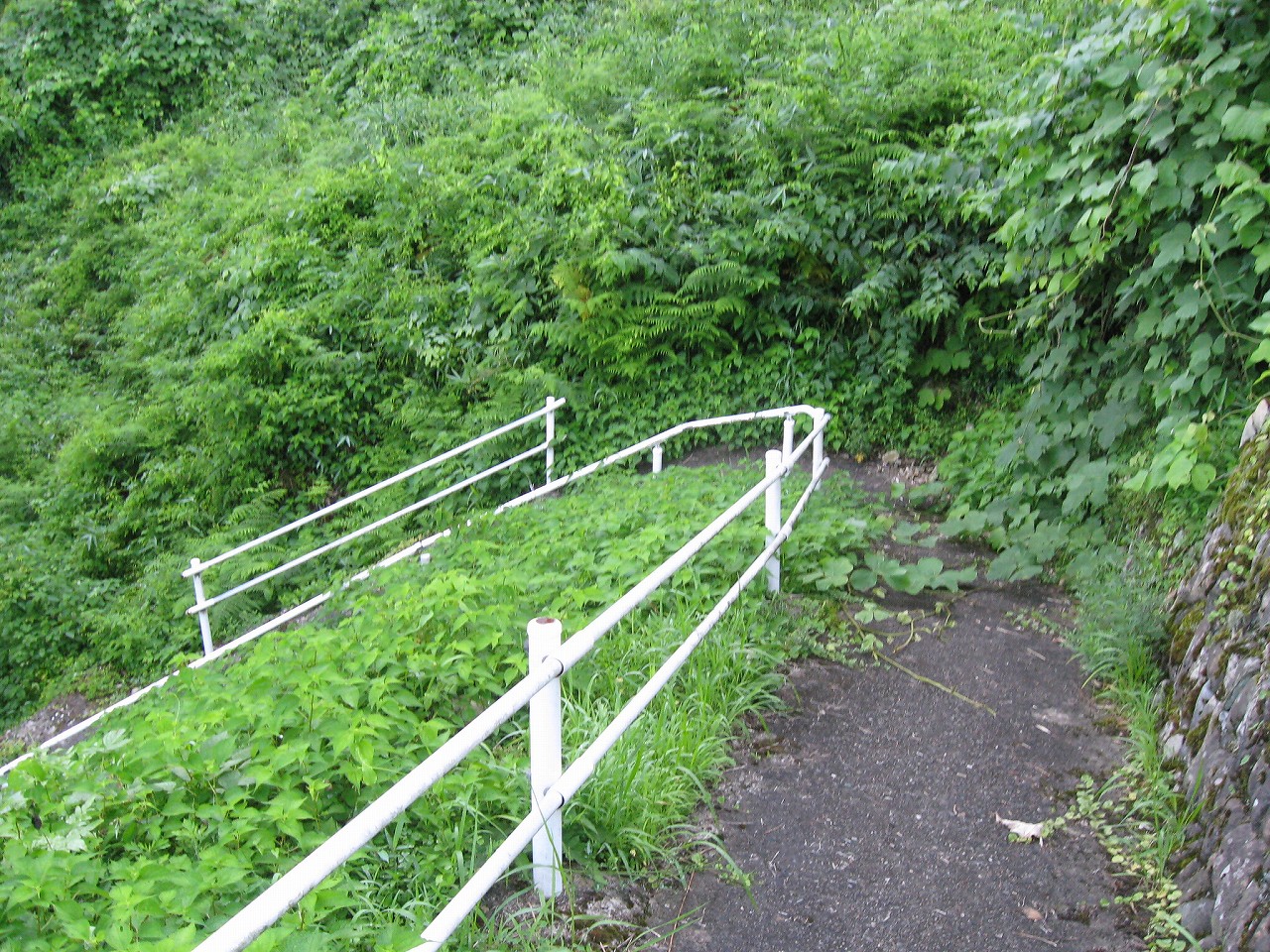 そんな感じだからホーム降りたところには人家などなく、どこからか道を下りて行って、眼下に見えていた川沿の県道に降りると思えた。遠くの山の上ばっかりが照って、ここはずーんと重い日陰という何とも寂しげなところだが、バスの時間もあるし、まずこの駅から脱出しないといけない。しかしその方法がよくわからない。案内板はいっさいないし、ちょうど人の幅しかない、緑の海を縫う道しかないのだ。車の幅の道もあったが、なんとなく遠回りな気がして、パスした。
