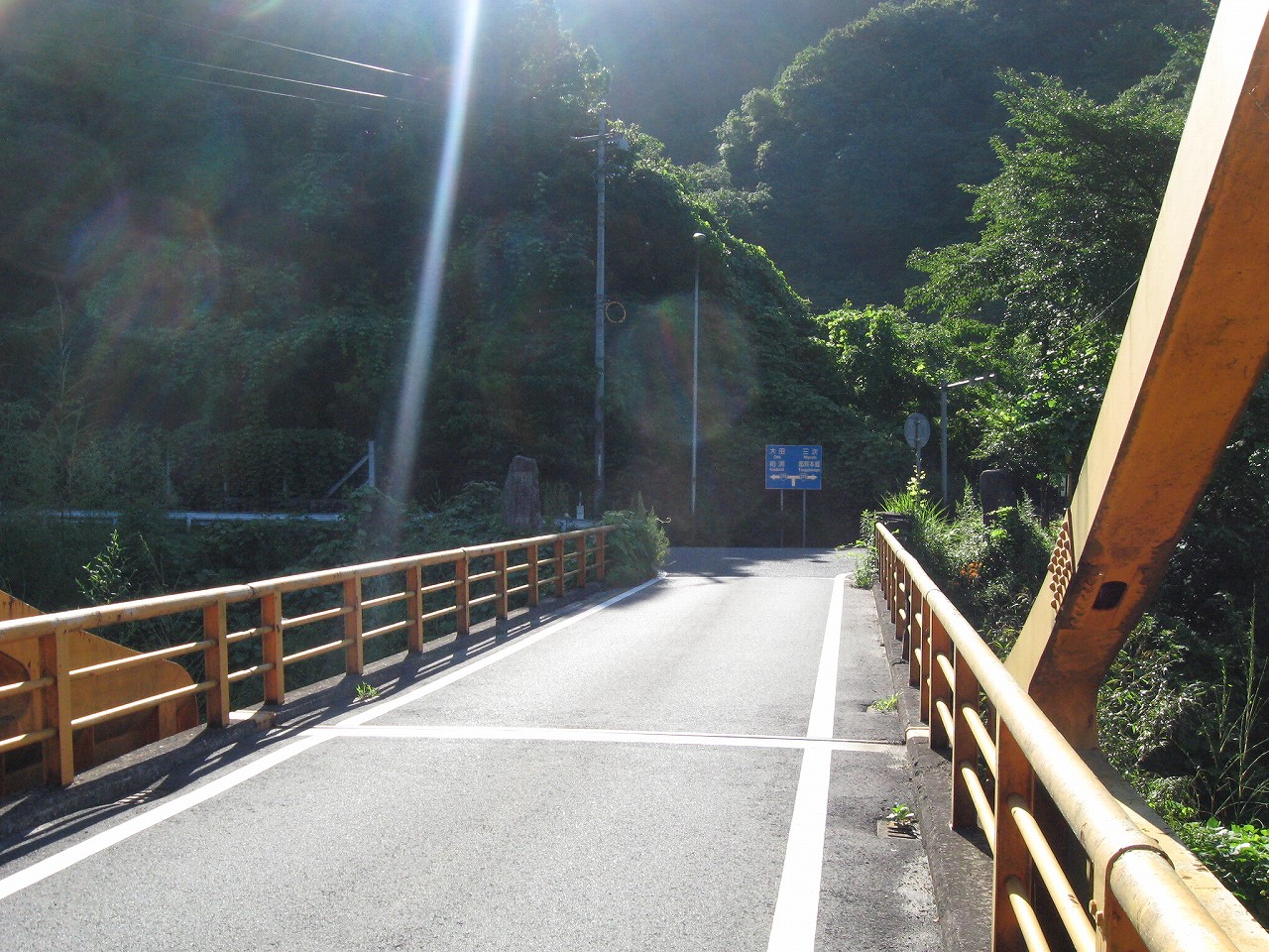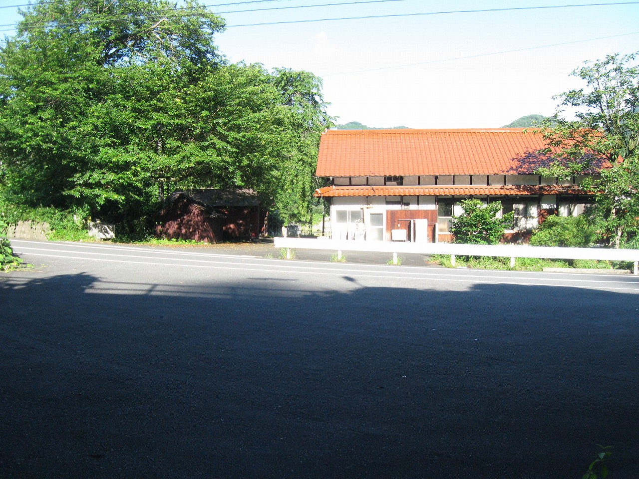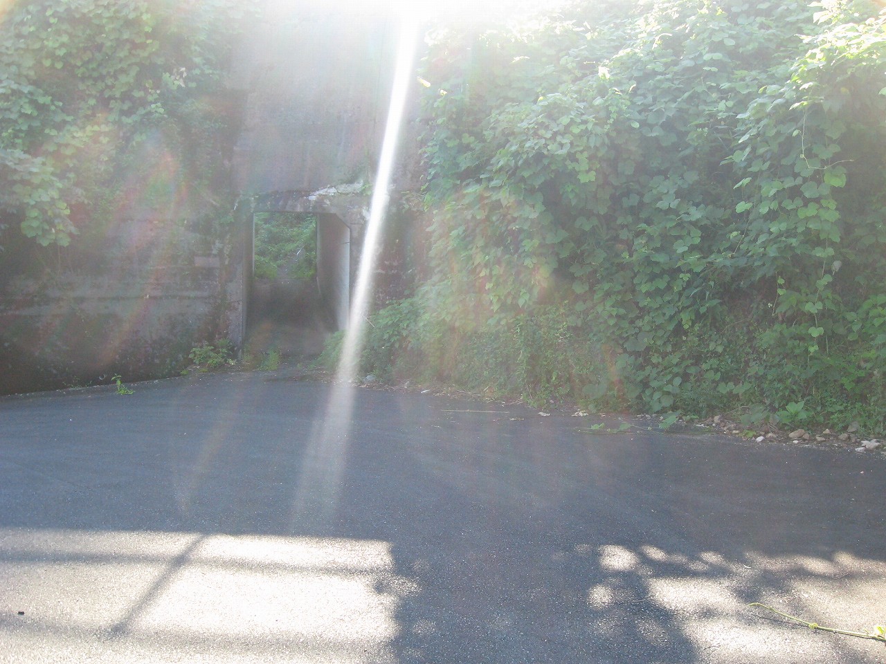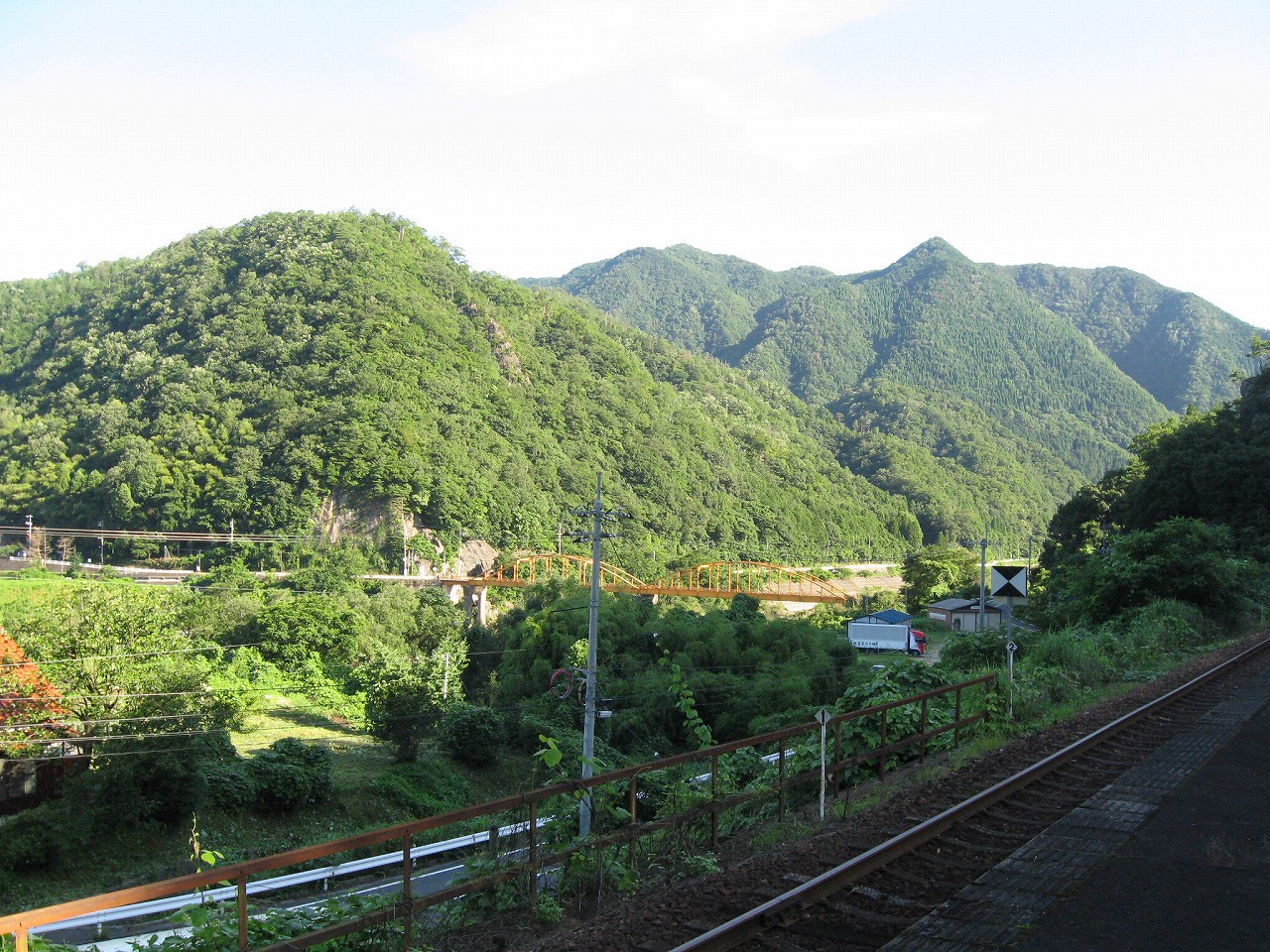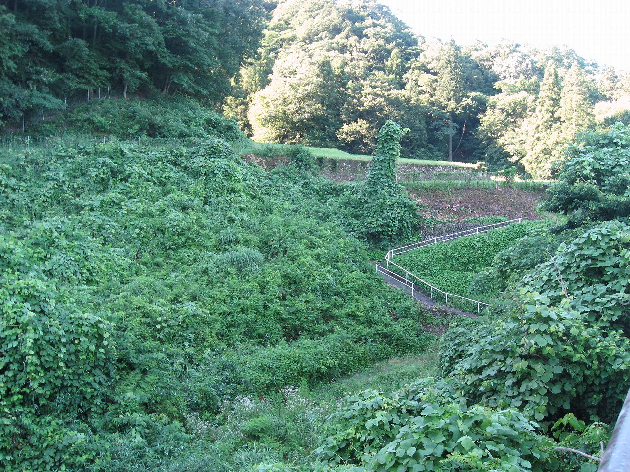 そんな感じだからホーム降りたところには人家などなく、どこからか道を下りて行って、眼下に見えていた川沿の県道に降りると思えた。遠くの山の上ばっかりが照って、ここはずーんと重い日陰という何とも寂しげなところだが、バスの時間もあるし、まずこの駅から脱出しないといけない。しかしその方法がよくわからない。案内板はいっさいないし、ちょうど人の幅しかない、緑の海を縫う道しかないのだ。車の幅の道もあったが、なんとなく遠回りな気がして、パスした。