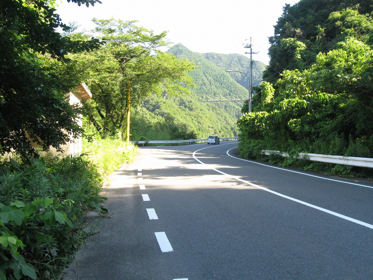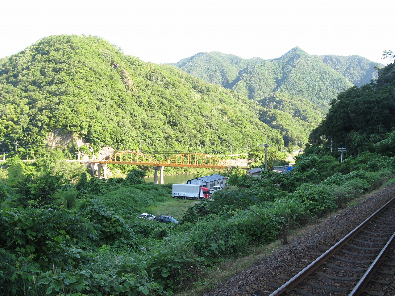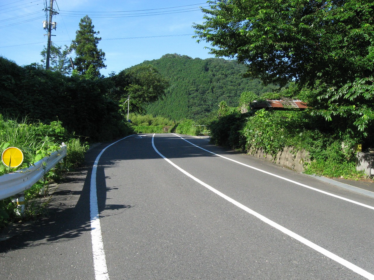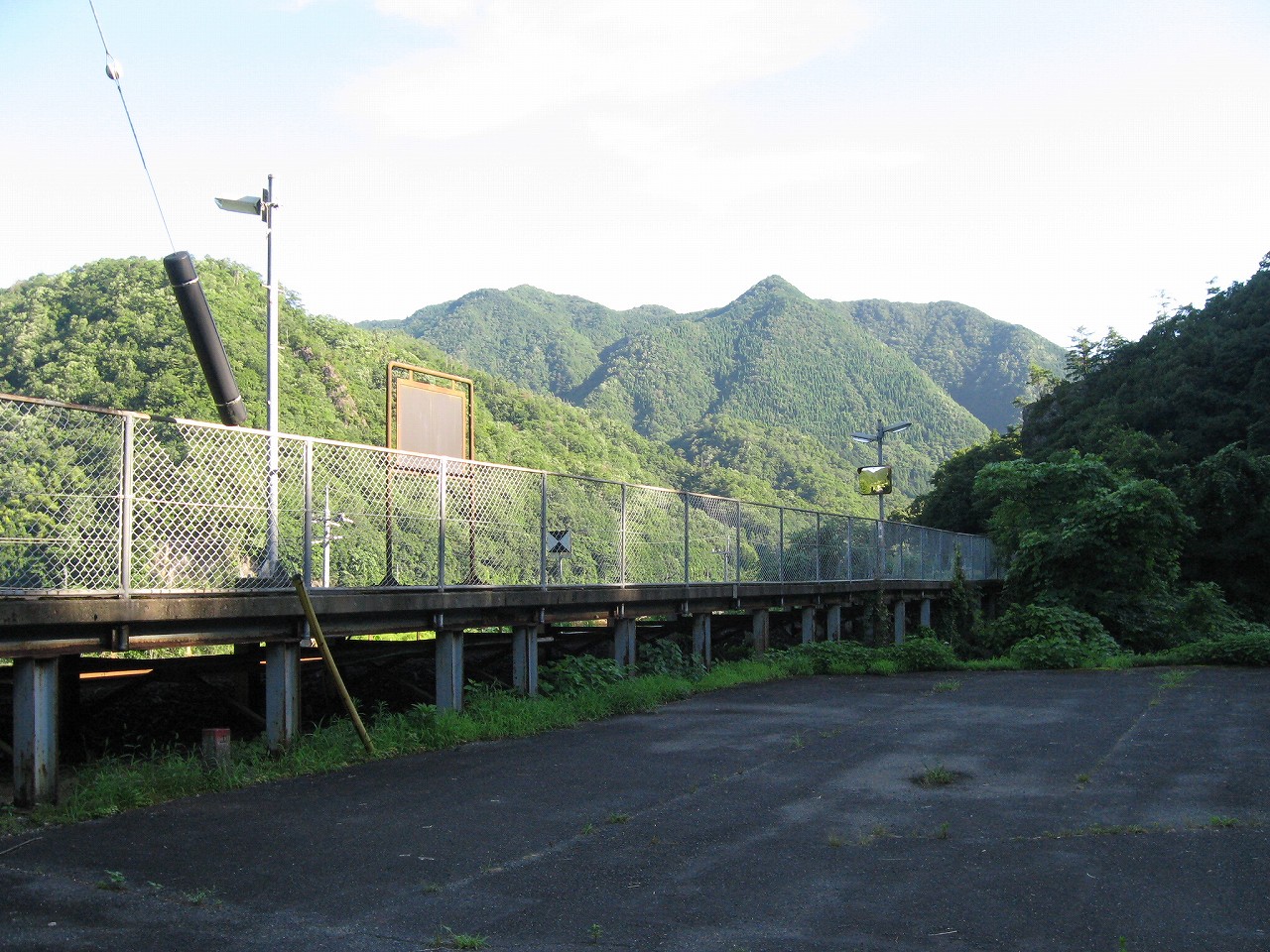 そんな感じだからホーム降りたところには人家などなく、どこからか道を下りて行って、眼下に見えていた川沿の県道に降りると思えた。遠くの山の上ばっかりが照って、ここはずーんと重い日陰という何とも寂しげなところだが、バスの時間もあるし、まずこの駅から脱出しないといけない。しかしその方法がよくわからない。案内板はいっさいないし、ちょうど人の幅しかない、緑の海を縫う道しかないのだ。車の幅の道もあったが、なんとなく遠回りな気がして、パスした。