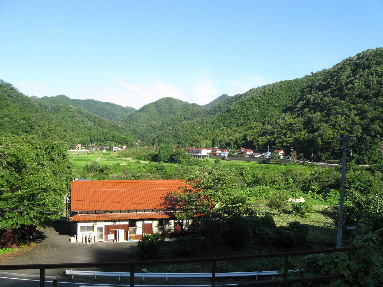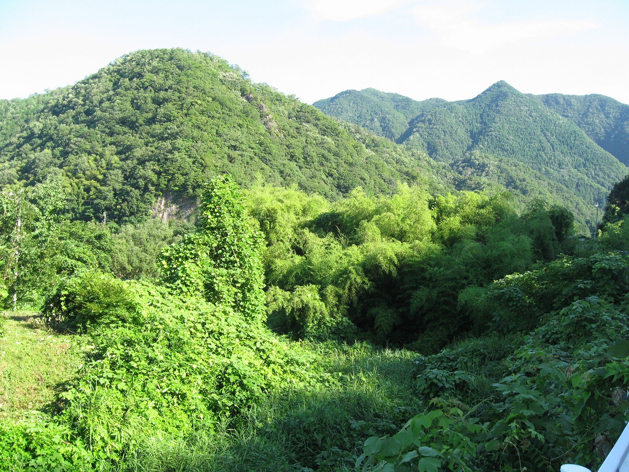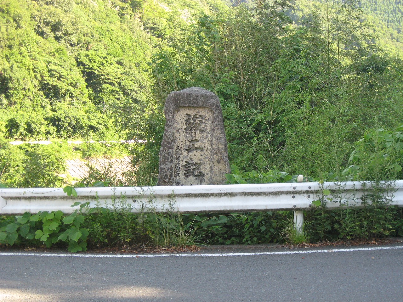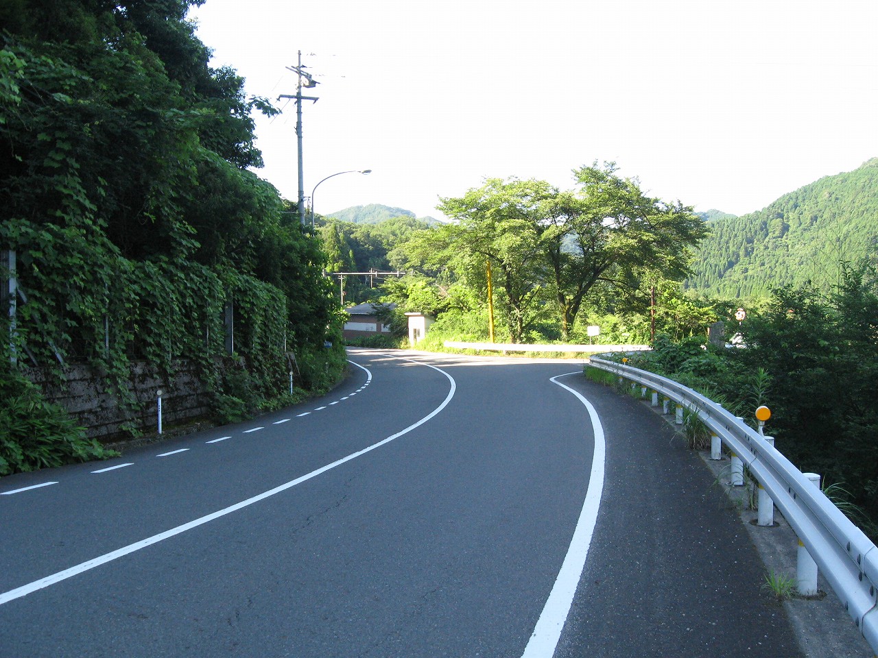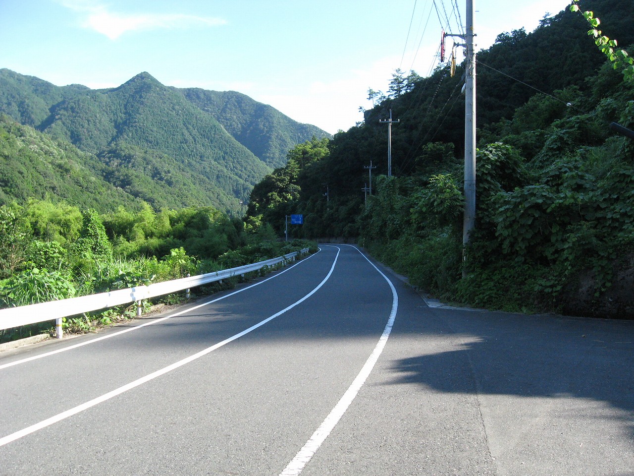 そんな感じだからホーム降りたところには人家などなく、どこからか道を下りて行って、眼下に見えていた川沿の県道に降りると思えた。遠くの山の上ばっかりが照って、ここはずーんと重い日陰という何とも寂しげなところだが、バスの時間もあるし、まずこの駅から脱出しないといけない。しかしその方法がよくわからない。案内板はいっさいないし、ちょうど人の幅しかない、緑の海を縫う道しかないのだ。車の幅の道もあったが、なんとなく遠回りな気がして、パスした。