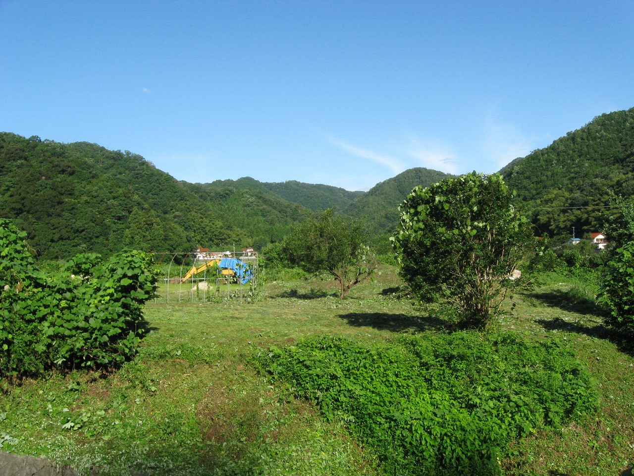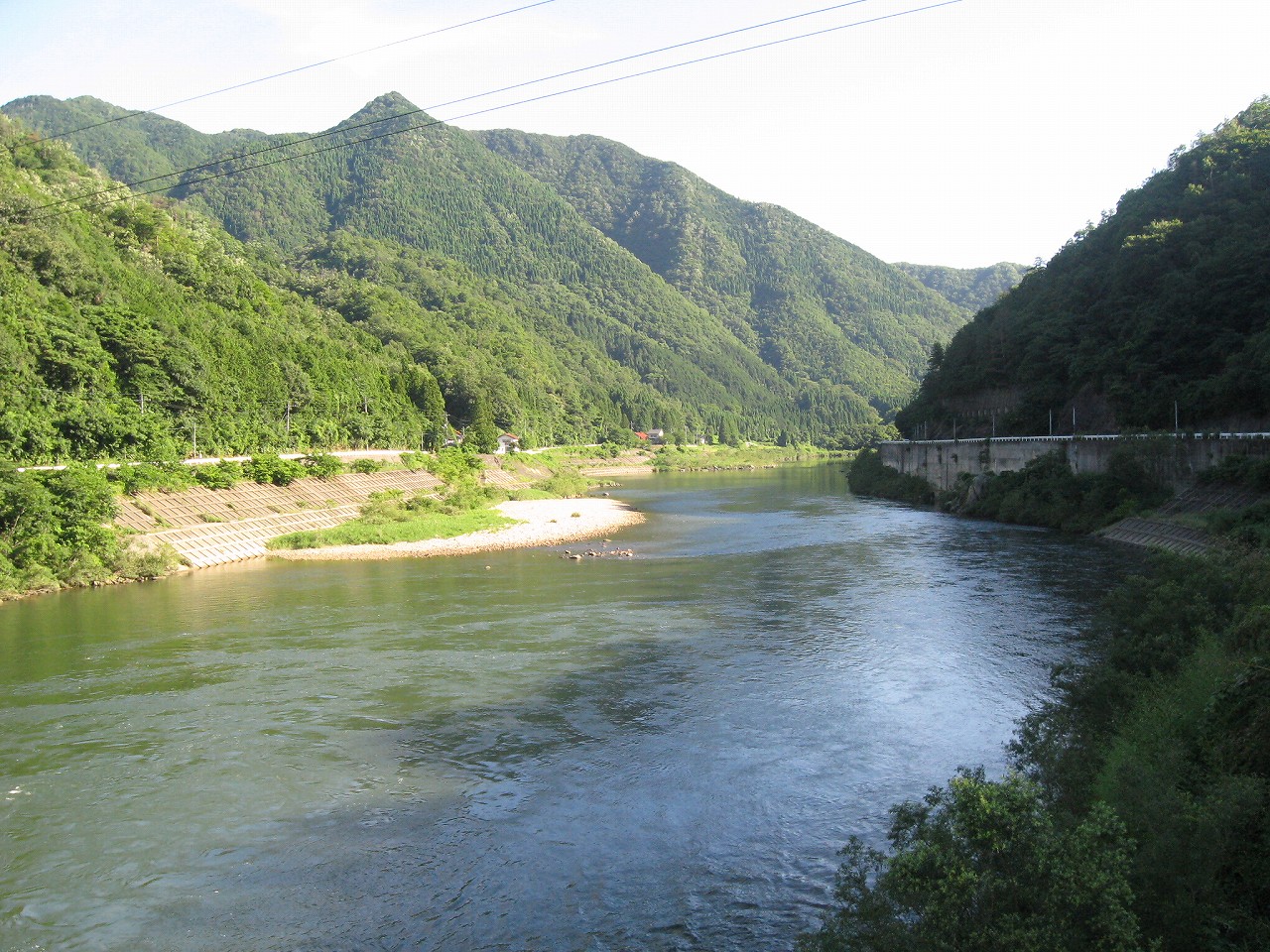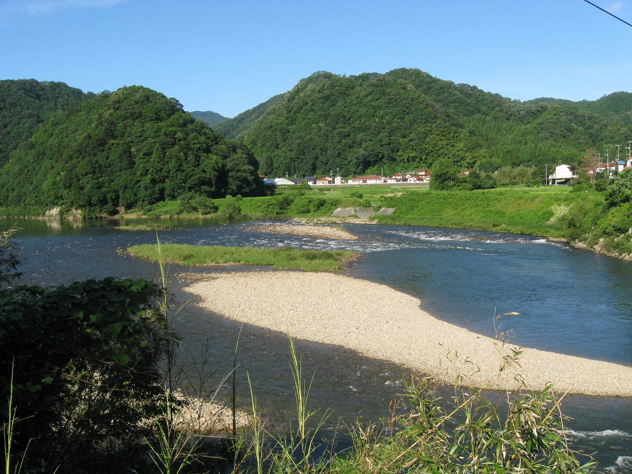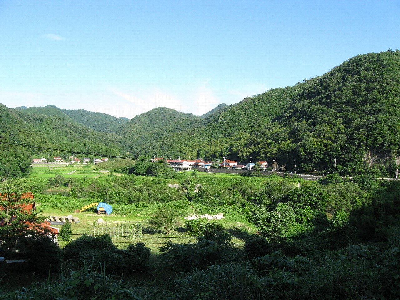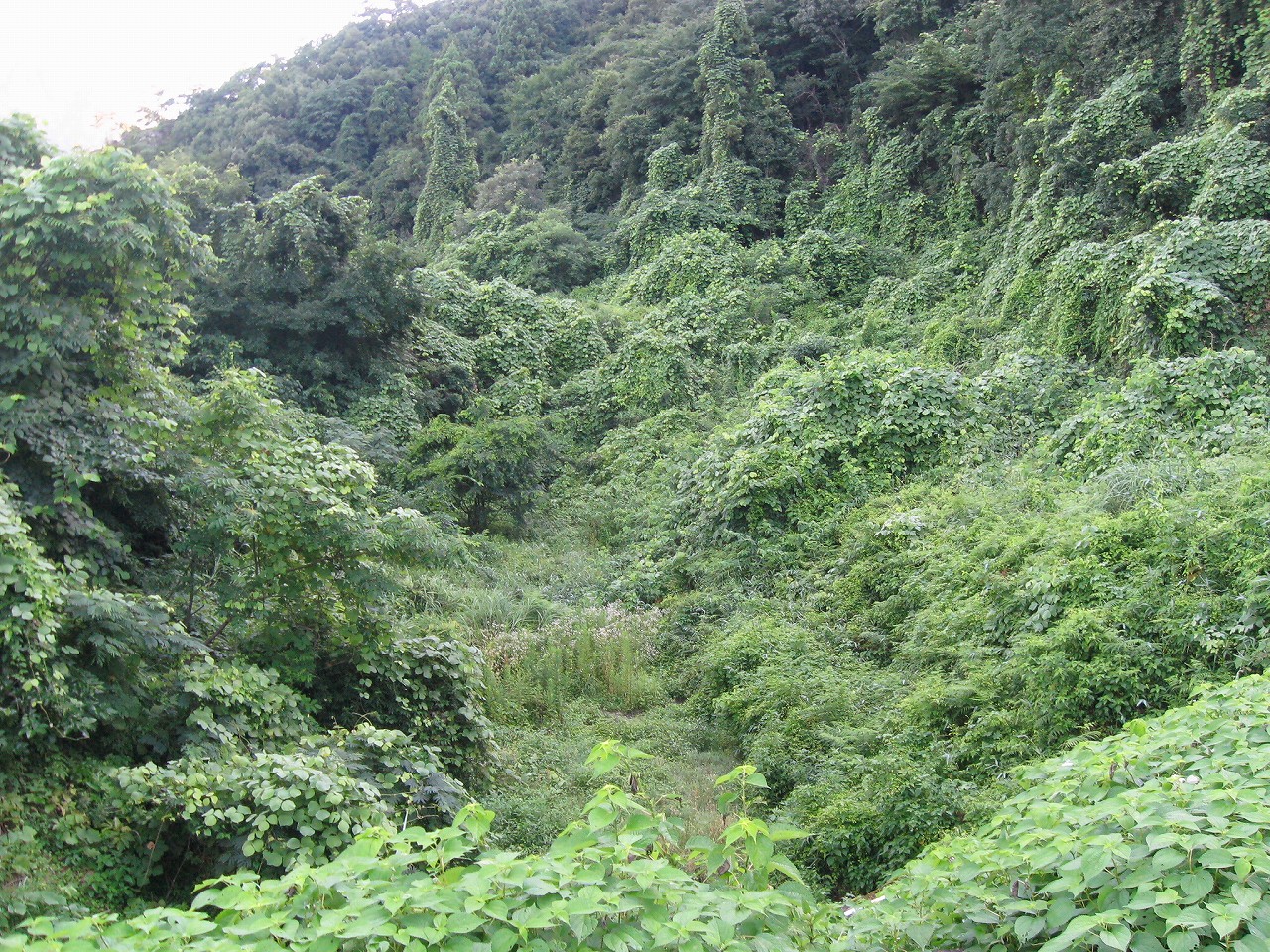 そんな感じだからホーム降りたところには人家などなく、どこからか道を下りて行って、眼下に見えていた川沿の県道に降りると思えた。遠くの山の上ばっかりが照って、ここはずーんと重い日陰という何とも寂しげなところだが、バスの時間もあるし、まずこの駅から脱出しないといけない。しかしその方法がよくわからない。案内板はいっさいないし、ちょうど人の幅しかない、緑の海を縫う道しかないのだ。車の幅の道もあったが、なんとなく遠回りな気がして、パスした。