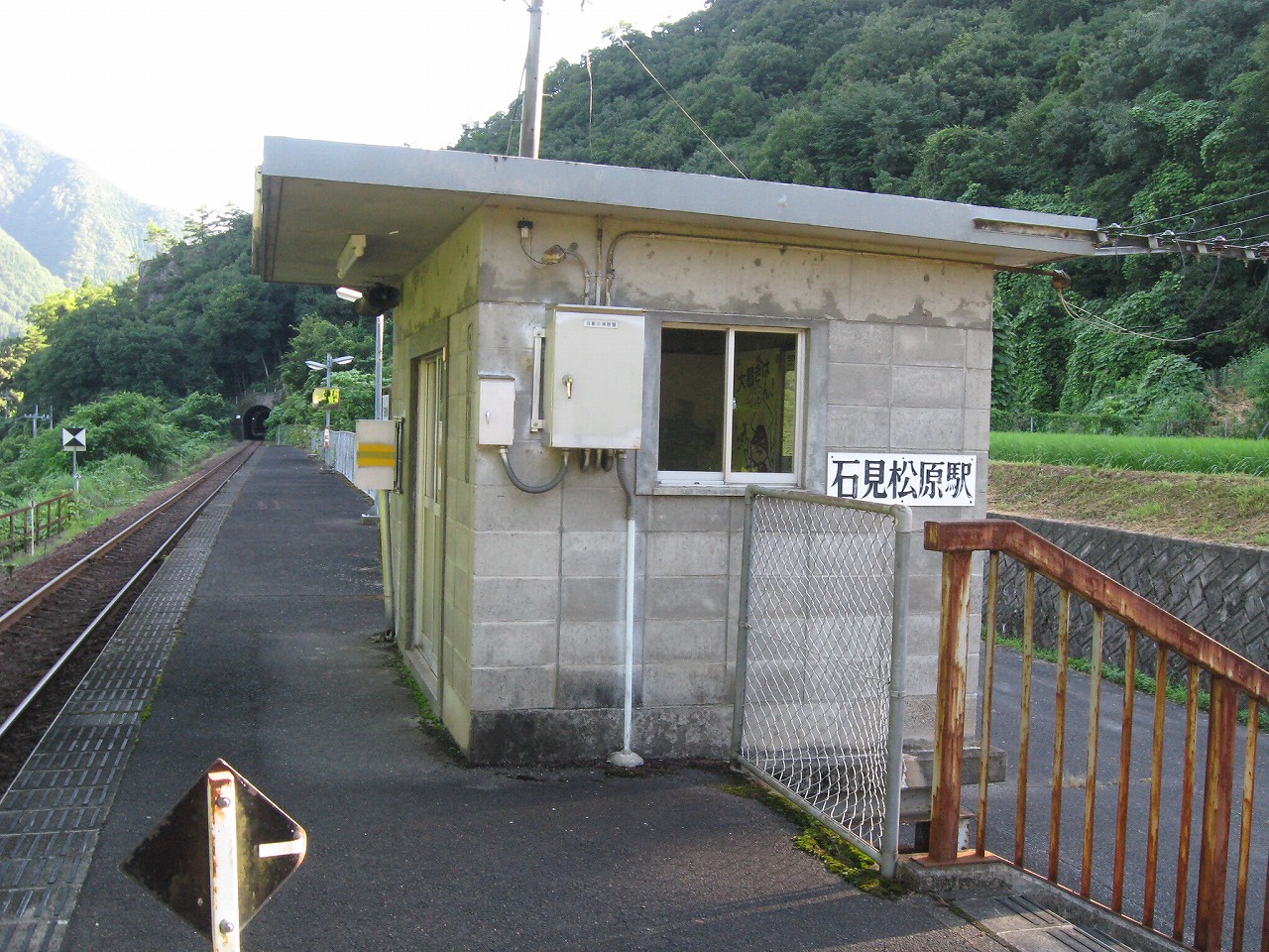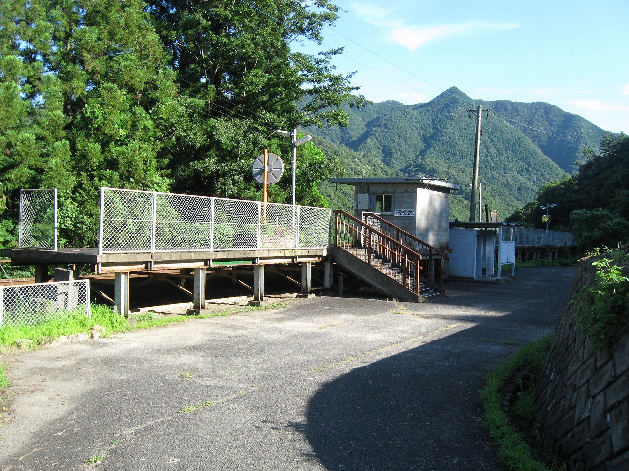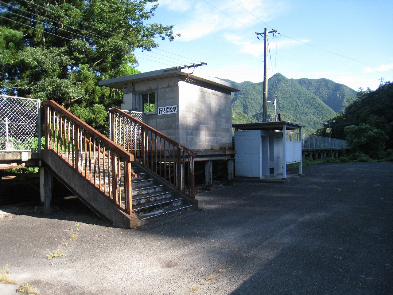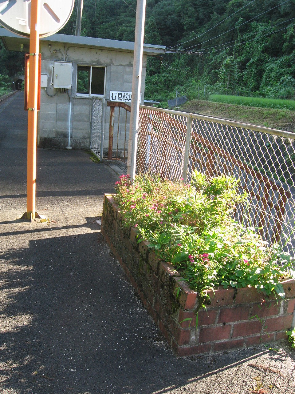 石見松原駅は想像通り、山影によこたふ、どこからアクセスするかわからないようなブロック積みの枯淡で渋い駅だった。ただの50年代の簡素な公共構造物でしかないが、そんなものにも哀愁を感じる。駅前の敷地以外は緑に覆われ、何もかも呑みつくさんとしている。手近な山の斜面には向うに二本の高い棒か何かが緑にまとわりつかれ、僕はなんとなしスキー場を連想した。駅前の敷地のどん詰まりもそんな感じで鬱蒼とした緑に覆われている。かつてはそこにも何かあった感じがした。