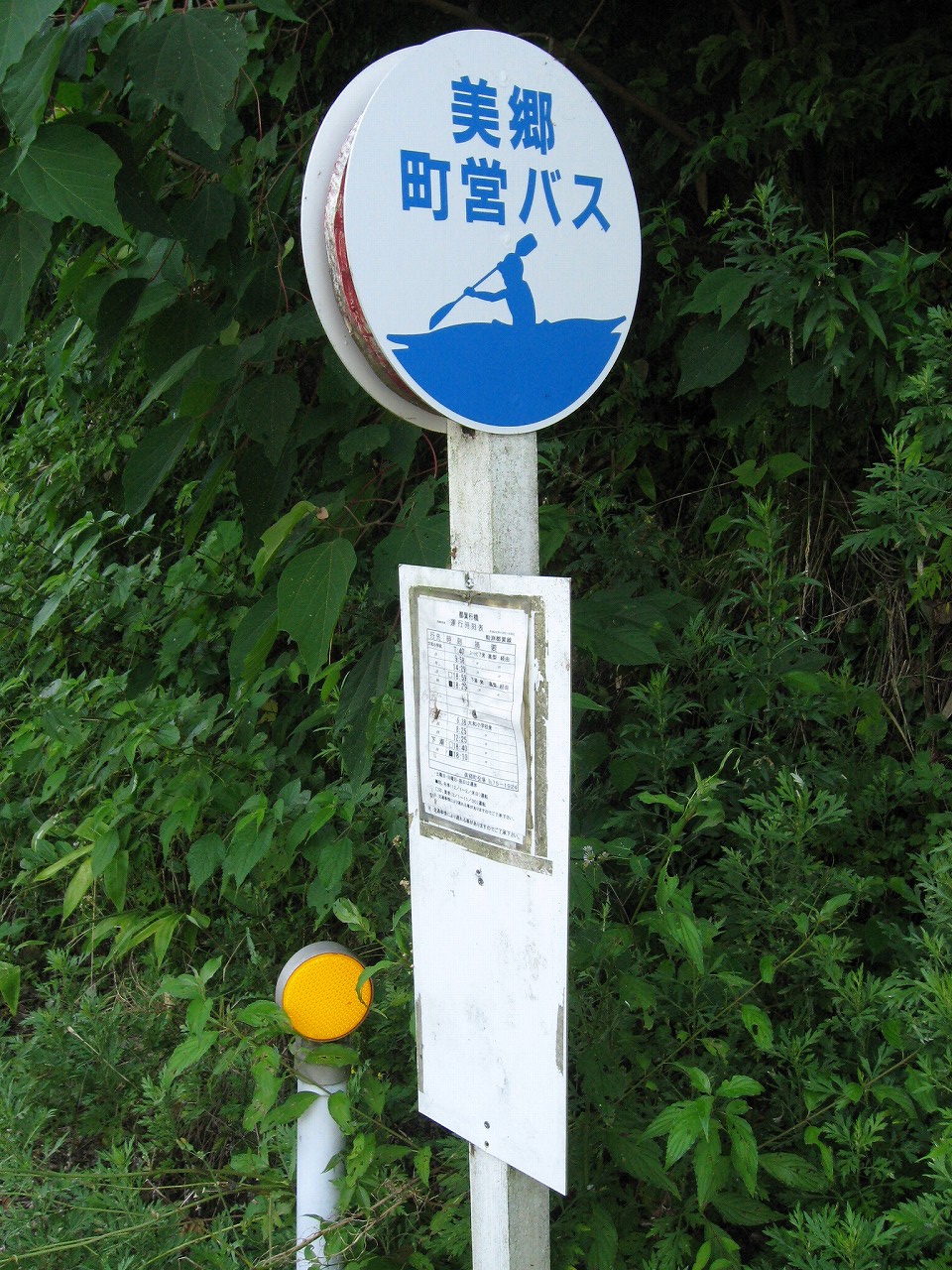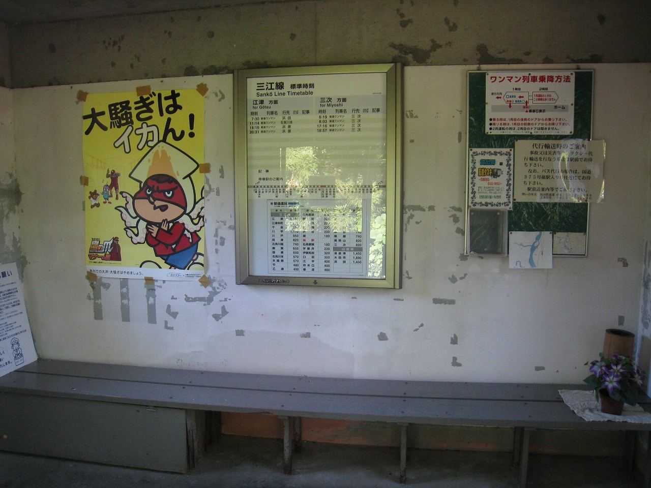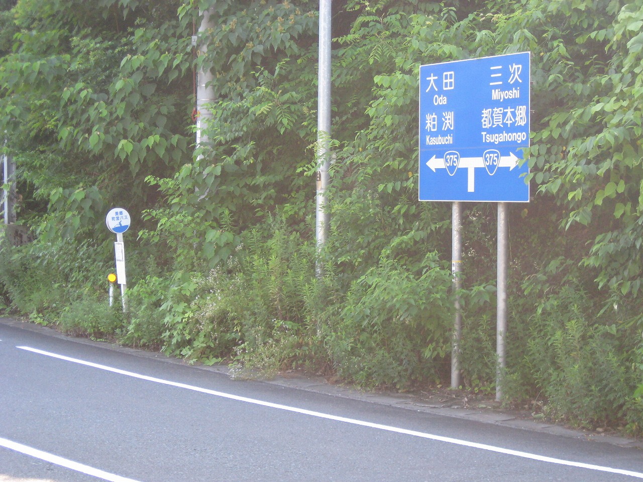 困ったなと思った。バス停には両方向の行き先の時刻表が書いてあり、自分の乗りたい潮方面(浜原・粕淵方面)のバスの運行時刻も書かれていた。しかしこのバス停の立っているのは、逆方向(石見都賀・三次方)の車線だ。