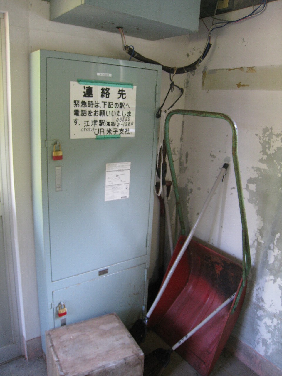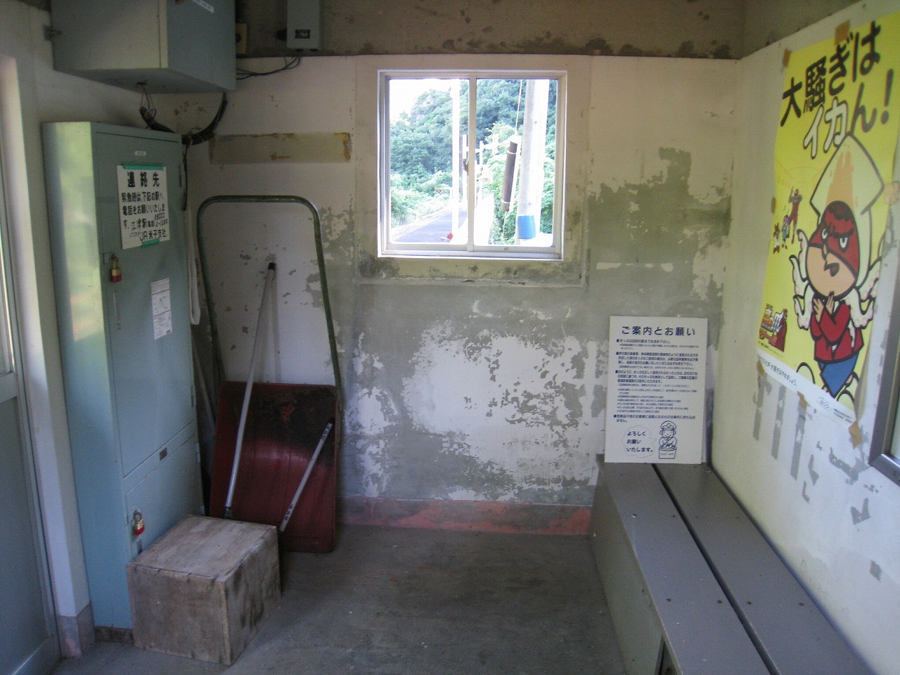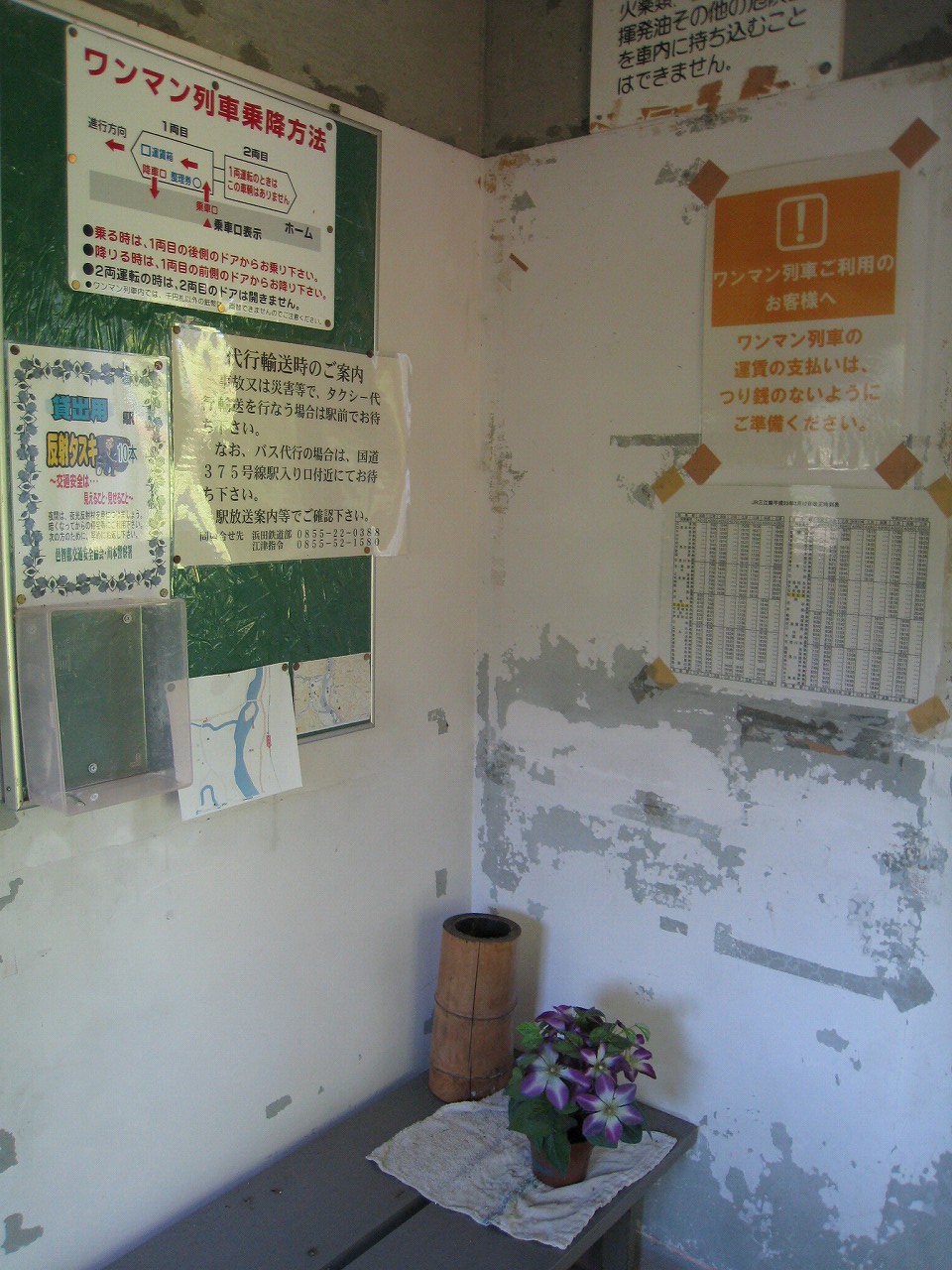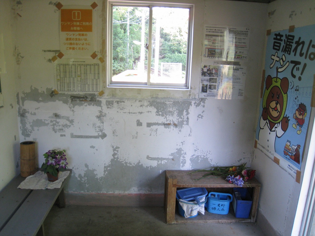 待合室はこの区間にはどこにでもあるもので、ペンキがはがれまくってる中もそっくりだった。しかしホームには一つだけ花壇があって花が咲いていて、待合室内には婦人会の名を冠した青々としたじょうろもきれいに陳列されている。朝な朝な当番で誰かやりに来てくれているのだろうか? 自分の地元では面倒な当番という扱いだが、ここはそんな感じはしなかった。