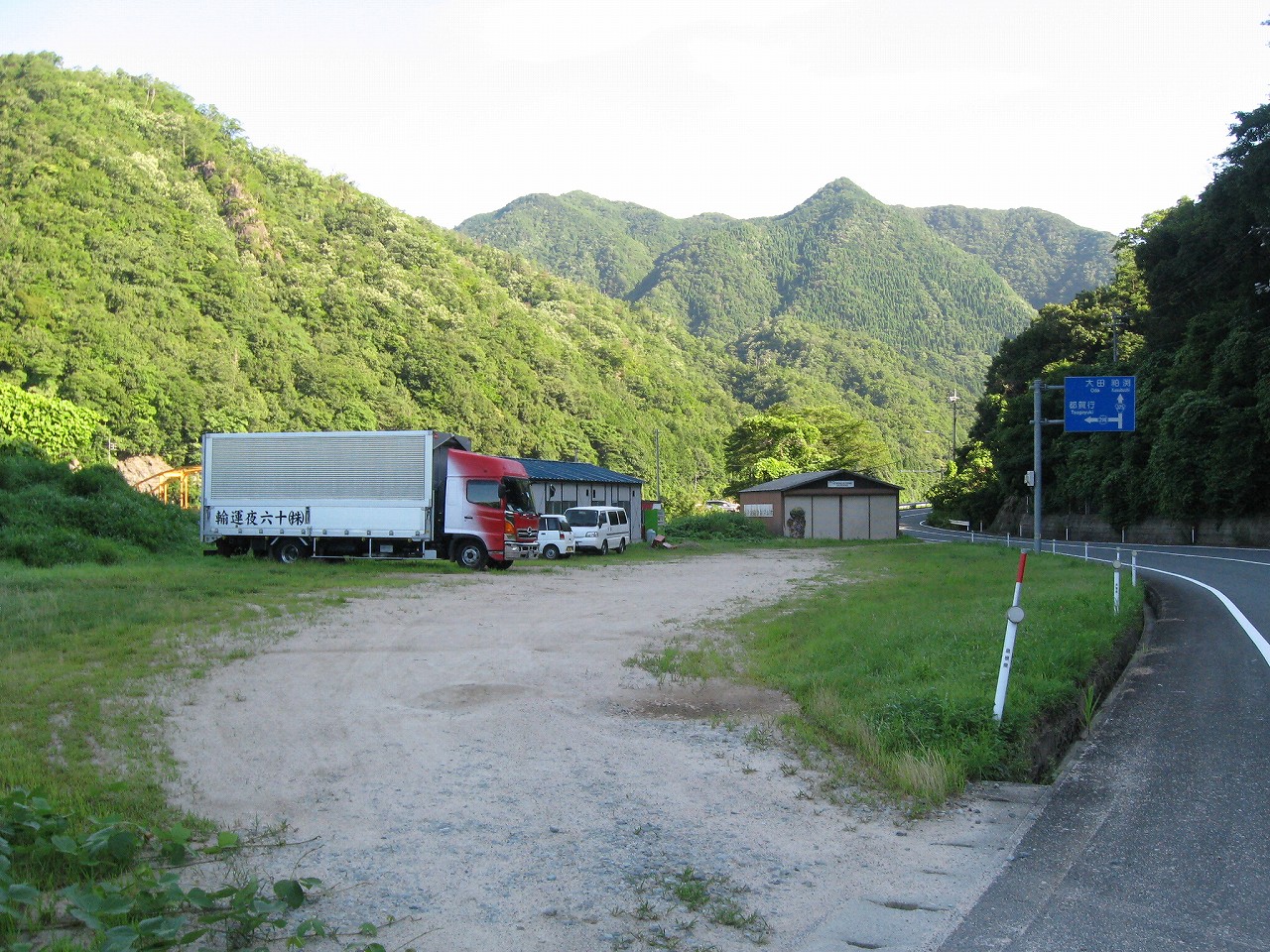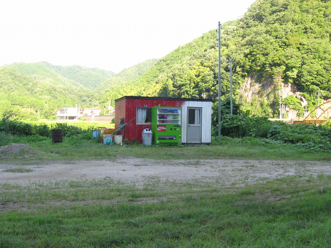こういう道路沿いの広い土地を土のままで、一人社員として運送会社に、資材置き場に、というのはよく見かける。けれども、土地があるっていいな、と。電気も引いてきて、自販機置いて、プレハブ置いて、仕事もあればあとは…。