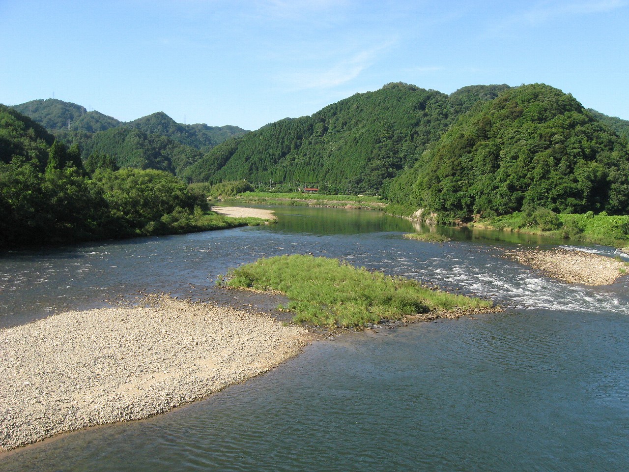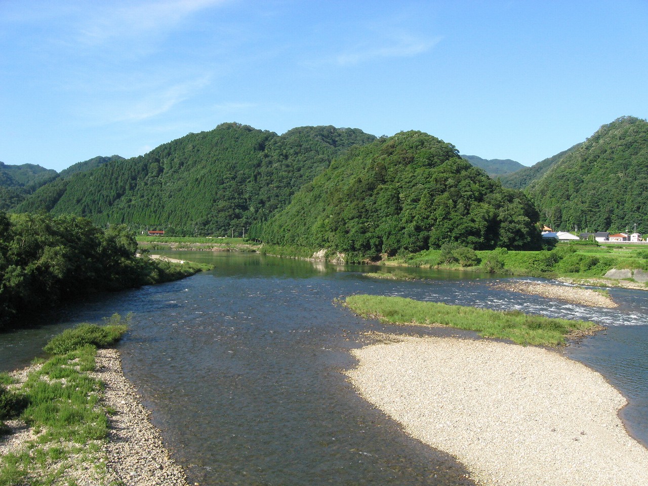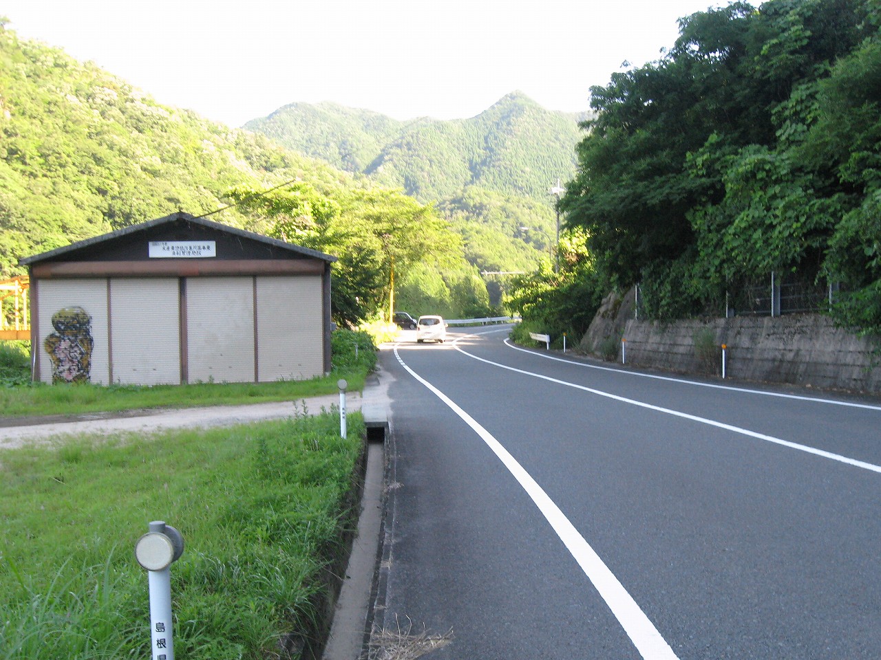 この辺りも街道上、つとに平地を、対岸に少しく抱卵するところで、そうして里山の前まで一面の緑が広がっていた。向かう江津方には石見山、なかなかのいくつもの小鋭鋒が控えている。もう島根の海辺の市街を予感してもいいのか。