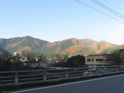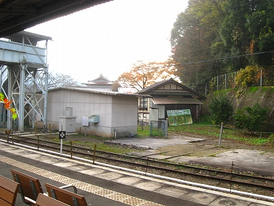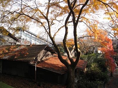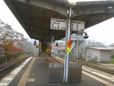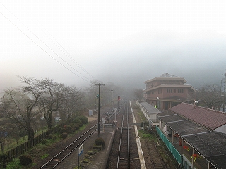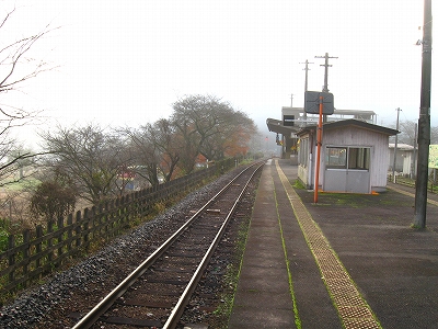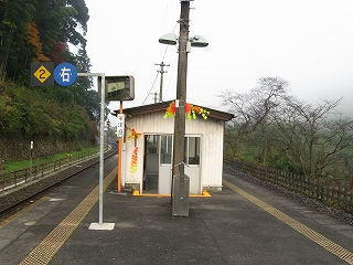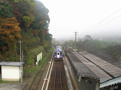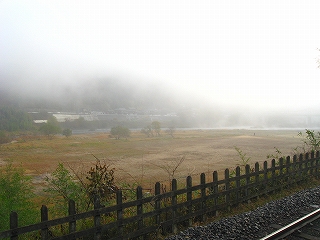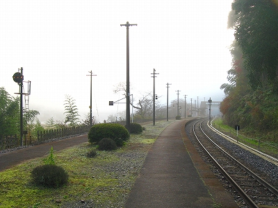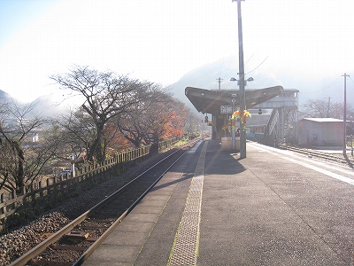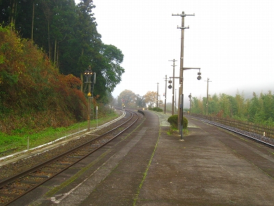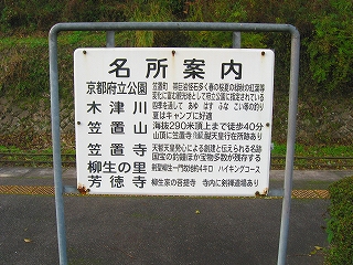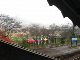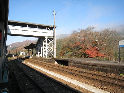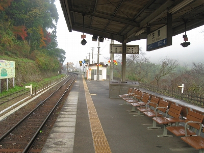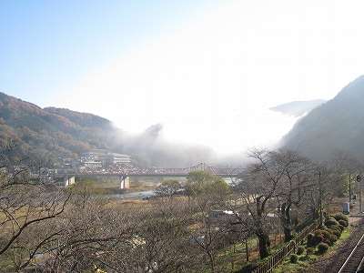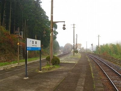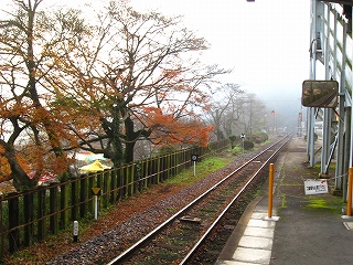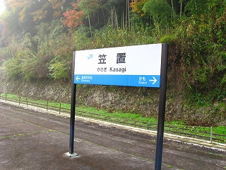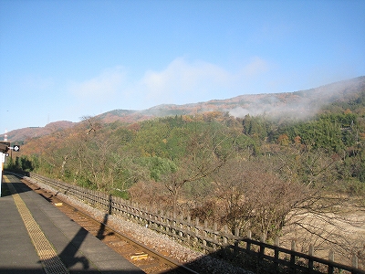 笠置なる駅につきぬ。古の旅人もや休みけむ、さらばあも休まほしう思ひておとなひつるが、いと冷たく指ぞ裂くるごとくなりし。こほりにぞふれるたらむや。川面よりいみじう霧わたりて、さらに消ゆけしきなく、げにいぶせきこと言わむかたなし。かたはらの常盤木の山裾に、もみぢふ木の一本のみけやけかるを、いとをかしう思ひき。あはれ、寒かりしも、竜田姫はおとなふらむを。