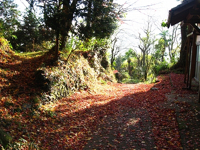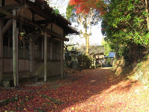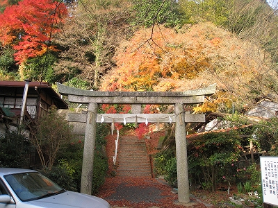 かたはらにもみぢふ山に石の階(はし)あるを見て、まうづべしとぞ思ひぬ。栗栖天満宮なるなり。菅原道真公をぞたてまつりたまへり。転ばむとす険しき いしばしをのぼりあへ、散りしかれぬるいろいろのもみぢ踏みしだきてゆくに、あしたの霧ならんや、いくらかたえてひちて透きたるものありけり。ほつえにさがりたるひとひらのもみぢは露そひて、いとど匂ひにけり。頂きにつきてせばき参道を歩かば、倉など佇みたりてしめやかなるなり。ふと向かひのつらの本殿のまへにて、奉りて棲まへる人ならむや、三十ばかりの女、あをまもりてあからさまに優におもてうちかたぶけたらむけはひすずろに覚へるに、いとおどろかれぬる心地こそしぬれ。さにあらむも、あなや、とくここをかるべし、あやしまれてむ、とて、せはしくいしばし下りたりき。しかれども当世の人のこれを読みしかばいかでことわらむや。