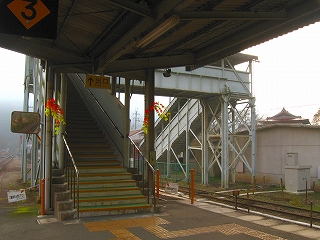跨線橋。昔はホームの端まで歩いての構内踏切だった。