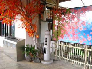 回廊にもみぢの大枝差し飾りたるは折り取りけらむやと思いひしかど、似せ造りにて、さりともさすがにこころにくき心地しき。五十ばかりの、頭 角に刈りたる かたくななんめる駅子、暗がりにいますが、さに見えしのみなるなりて、衿もかたう薫り聞こゆげなりて清げにいまし侍りき。おのづから、人の入りて苞(つと)渡ししが、駅子ことにはかばかしうよろこびも言はぬさま、わづかになつかしう覚へり。