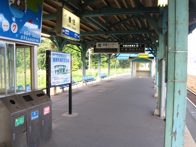 駅の軒がもう見掛けないビニール屋根だが どこもぜんたい小ぎれいに保たれていて、古くささがなく不思議だ、なぜかちょっとがっくりする。漂う時間もやはり今のもので、それは活気の乏しさのせいだろうか、しかしそれがこのざらついたコンクリートの石段の清さにくみしている気配がしていた。しかし相応しくない大きな変化を受けずに来られたというのも、幸せなことだと思える。香住を誰かが正格に守っているとまで思えたりする。香住の高校では、漁業を習えるのだそうだ。だが変わらなさ過ぎて、無関心を誘っていそうな気がし、私もここに住まっているがごとく この駅が空気のように思えてきてならなかった。変わるなとも、変われとも思わない。いつ来てもこのままだという安定感があった。それが海岸や蟹や、気候にもそう思えてくるのだから、広い話だ。