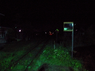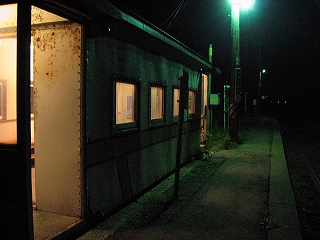 汽車を降りる。驚くほどの寒さ。これは西日本でいう冬だ。電灯で明るいエンジンのやかましい気動車が去って見えなくなると、一気に寂しくなった。ただ風の音と、草のそよぐ音、虫の音(ね)しか聞こえない。そしてしたたかな山の気配。遠くの赤信号に信号員を期待した。しかし、目を凝らしてもただ赤黒い灯火が一人で燈っているだけだった。 ホームは雨ざらしで短く、石でできているのにもかかわらず、刃こぼれしてぼろぼろ、そこに錆びて腐蝕した貨車が固定されていて、駅舎になっているのだ。ホームは水銀一灯で照らされ、あたりの様子はわかった。すぐ近くに人家がある。しかし明かりが付いていなかった。それでも廃墟というのではなかった。