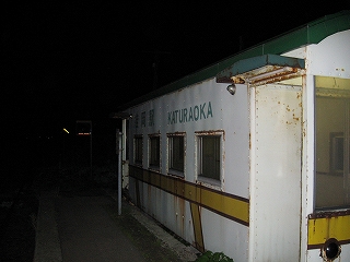 森の中をゆき進み、小枝に窓をたたかれながら、こっくりこっくりと列車は進む。しかし湯ノ岱まで来たということは、もう半分は来たということだろう、と思い、降りる駅を勘定すると二つ先であった。きついカーブを曲がりきろうとするころ、宮越が案内される。ふっとカーブの出口が見えて、ヘッドライトの照らす駅へと近づいて行った。驚いたことに、駅舎の電気が点いていない。真っ暗だ。そういえばこれまでの駅でもそうだったような。すると、自分の降りるつもりをしている駅がそうだったらどうしようかと打ち震えだした。宮越でも、当然、誰も乗ってこない。「乗ってくるわけないんだよ! 乗って来る方が不自然なんだよ! こんなところのこんな時間には、誰も乗って来やしないんだよ!」 そう心の中で怒鳴った。列車は宮越を出、やや平明なところにころりと出た。次が桂岡で、そこで降りるのだ。そこでは一晩明かした旅人もいるということだったから、さすがにもう山の中ではないようで、納得がいった。桂岡が案内される。肚の中に血液が凝り固まった。いちおう駅舎たる貨車に電気の点いているのを確認すると、とりあえずは安心して、列車を停めた運転士に切符を見せに行った。彼は「はい、ありがとうございます。」と、ほっとしたような、わかりましたよ、というような口調で言った。そして私の身なりを確認した。きっとここで寝るともうわかっているのだろう。