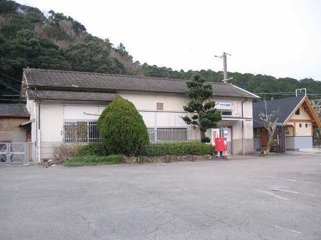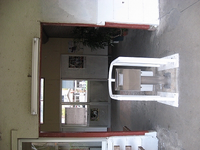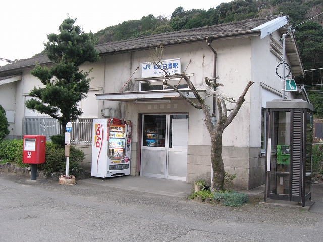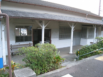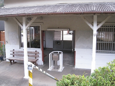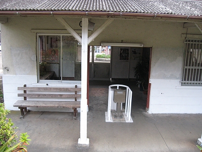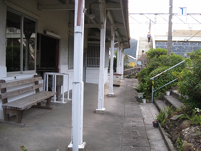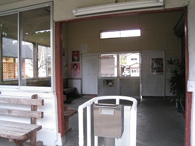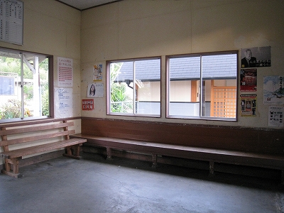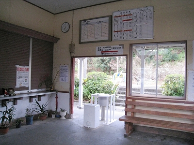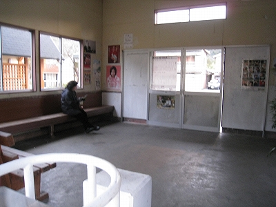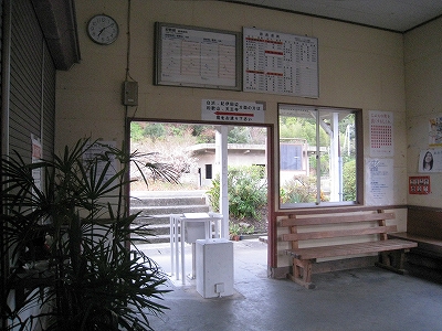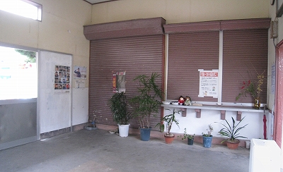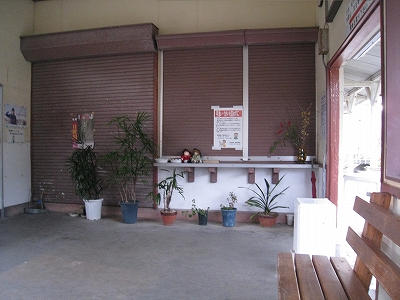 駅舎はバスの待合室としても使われていて、これからどこかの観光施設に勤めに行くのかしらと思った。女中さんもこんなしてかよっているのだろうか。やはり引き戸はなく、どうでもいい鉢植えが並び、土が床に薄く伸びていた。いわゆる「ばあちゃんの家」化である。「こうなるともうだめなんだよな…」 駅舎もだいぶ前のものらしく、モルタル塗りながら、かなりよれっとしていた。旧字の右書きの駅名の痕跡もある。