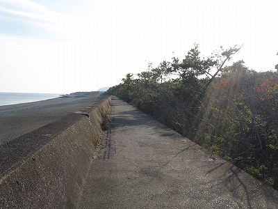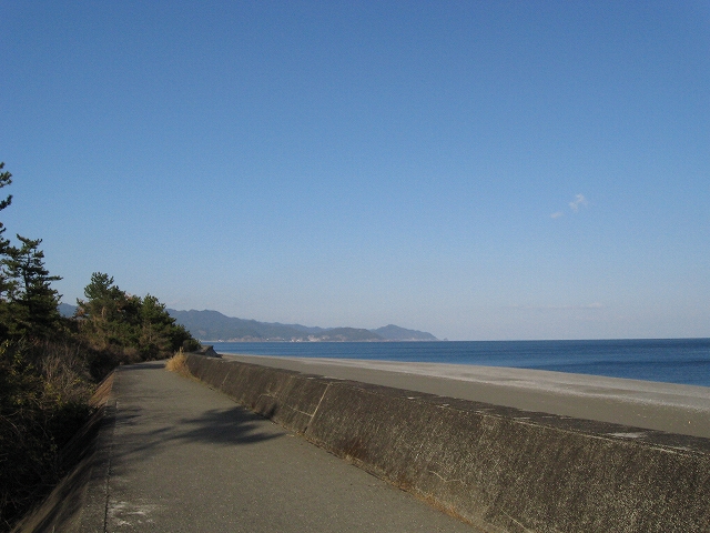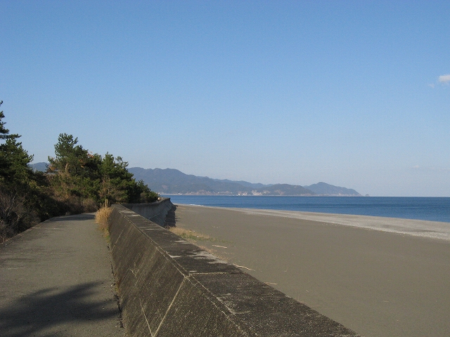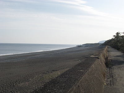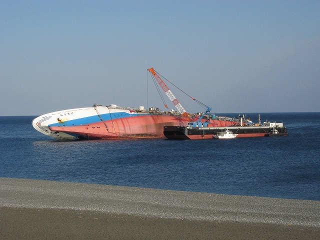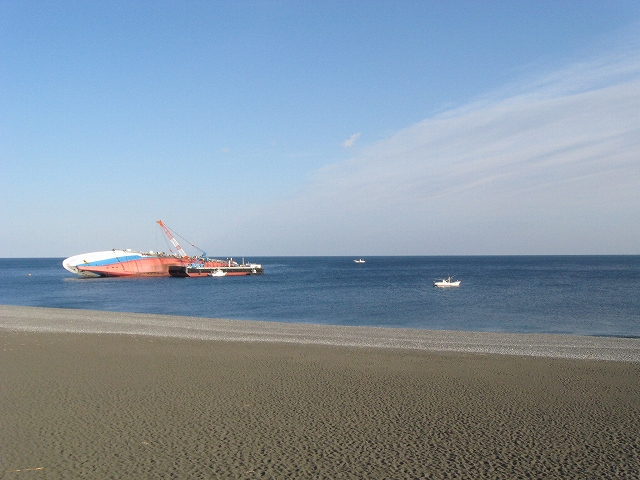 交通量は和歌山にいるたときより格段に増えた。といっても梅ヶ谷などの山間まで及ぶことはないだろう。防潮林を縫って、堤防越しに海を眺め下ろす。黒い道のような浜の向うに相変わらず果てしない砂礫浜があり、彩を失った大洋が揺籃され続けている。ここには海の持つ二面性の一つの不気味さが表れていた。フェリーありあけが座礁して横たわっている。作業する人もいない。大事件だったが、たった数年で覚えている人もいなくなるとはこのとき思ってはいなかった。この事故があったから私も紀南行きはよそうかと思っていたくらいだ。油が流出し、解体作業も行われるとのことだったからだった。さっきの七里御浜からも小さく見えていたが、こうしてひっり返った船を目の前にすると、こんなことで思いとどまろうとしていたのかと思う。それだけ望洋を楽しみにしていたのだろう。つまりは、冬の南紀という想像、そしてそういう現象を追いかけているのだ。そしてそれは作られたものだ。