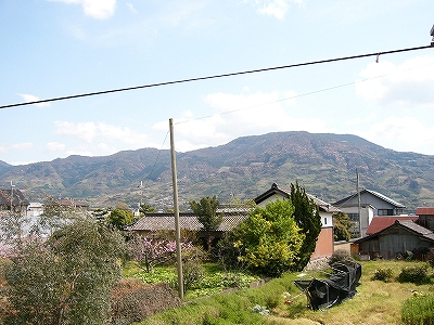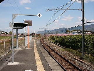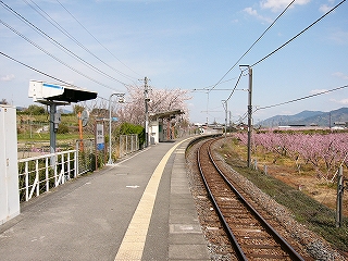 粉河から30分に1本の地帯に入ったせいか、 どこか街に近づいた感じだった。 紀ノ川の流域もあたりまえのように広くなっている。 すぐに紀伊長田に着いた。ホームだけの駅だが、 弧を描いたホームは明るい桜並木で、 またホームの向かいは桃の花の咲いた果樹園だった。 そして果樹園のずっと向こうに、 パッチワークの炬燵布団のような龍門山がどっしり座っていた。 果樹畑になっていない上の方には山桜があるらしく、 ところどころ緑の中に、ぼんやりと桃色がともっていた。