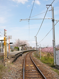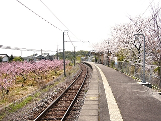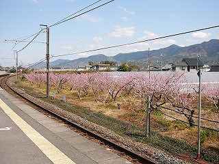 ホームの向かいには花いっぱいの桃の果樹園が。