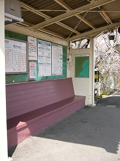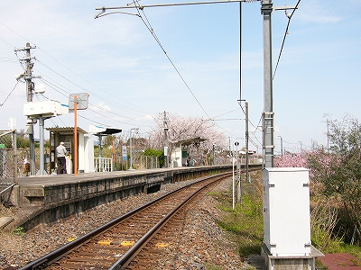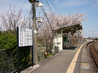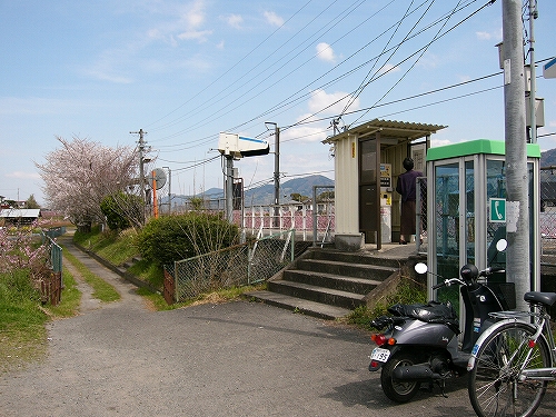 ホームの出入口の少し幅広な石段を下りると土の細道だった。 公衆電話の横に二輪がいくつか駐まっているだけで、落ち着いている。 里道は桜並木の裏に沿っていて、そこを歩くと桜の枝がじつに間近だった。 和歌山線の駅は落書きが多いが、こういうホームだけの駅にはないことがほとんどだ。 それでも枝をむやみに折る人はいないんだなと思い、桃色の木陰に少し佇んだ。 また、途中にホームへ上がる小さな階段も見つけ、 里道という小川から、また桜の流れという小川から、 堰堤に上っていくようだった。