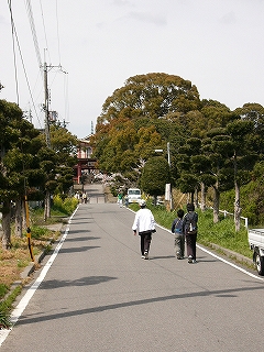 里道を反対側に歩くと 駅すぐ近くの踏切のそばへと通じていた。 こっちがよく使われる方向だ。 しかし踏切の道路は1車線で、自動車もほとんど通らない。 龍門山側はかなり向こうの方で国道に出ているらしいというだけで、 自動車の音も街のかけらも何もなく、通りが集落の中を突っ切っているだけだが、 その道は多少ゆれながらも実にまっすぐ突き当たりの山まで見通せるもので、 紀ノ川に向かってしだいに下り坂になっているのがよくわかった。 反対側は、向こうの方に寺院があるらしく、そこで道が止まっているようだった。 しかし実際には道が山門前の手前で左斜めにずれているだけだった。 寺では人出が結構あって、何か催されているらしく、音楽まで聞こえてくる。 道にもこっちに向かってくる人、あっちへ向かっている人がいる。 この寺は長田観音で真言宗・如意輪山蓮花院観音寺というらしく、 踏切近くの道端に標柱が立っていた。 目を凝らすと山門の向こうに桜が見えて、境内を多くの人が歩いている感じだった。 花見だろうか。