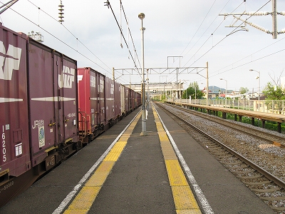 左の下り貨物は信号待ちで停車中。