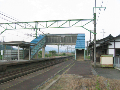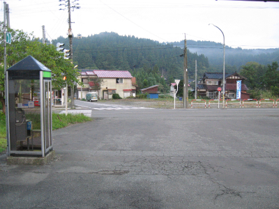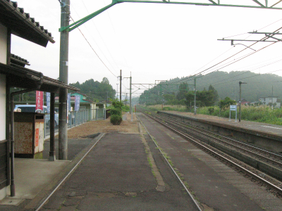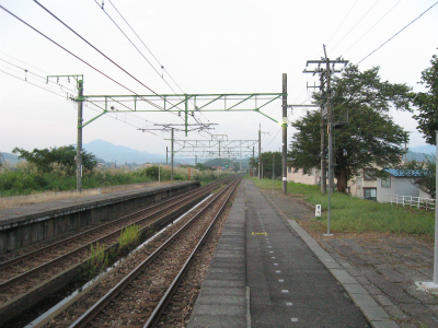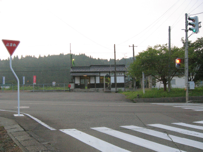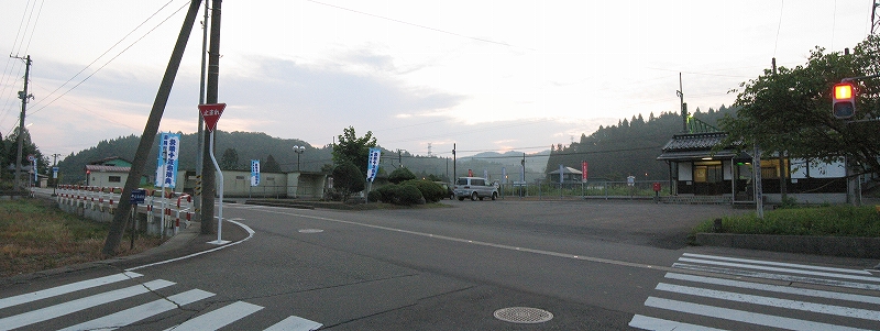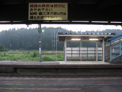 明ければ夜来たときと違いこんなところだったのかと思うことがあるが、ここは夜に見たとおりで変わりないところだった。柏崎から長岡まで行く途中にわりあい寂しいところを通るが、ここはその途中にある駅の一つになる。裏手は草はらだし、表に出てみても飲料販売機と信号で、どっしりまとまった集落でもなく、何でこんなとこに駅できたのかなと思わないでもない。むろんお住まいの人にとってみれば、ここがないと困るわけで、なかったら引っ越すかも、なんていう人も出てくるかもしれないと思えてくると、駅が定まってきたように見えた。