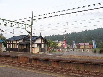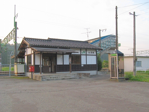 椅子も改められ、ホームの待合所は取り壊されているが、中越地震がらみもあるのかなどと思う。それなら仕方ないけど。駅舎は小ぶりな擬古様式で白壁に木柱が目立ってる。庭としてか、転回部としてか、広い池がしつらえられてたが、水は抜かれて久しそうだった。駅前わりと広く、意外に堅実な感じだ。でも昔は利用が多かったという遺構や感触はない。