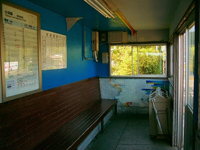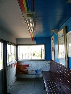 待合室内の様子。レインボーが塗ってある理由は、近くの三方五湖が五つそれぞれ色が違うからだろう。