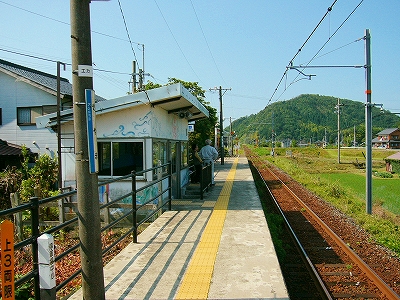 またもやホームだけの駅に降り立つ。駅舎もないから、自分はもの好きなものだと心底思わされる。さきほどの東美浜と違って、家が多くて、階段を降りたところに店も見当たって、夏の葉影に隠された小高い道路からは、トラックの耳障りな低い響きが耳についた。しかし、駅のあたりはすっかり落ち着いた集落だった。人の姿こそは散歩の人か自転車の人くらいだったが、けっこう人の気配は多いところで、そんなささいなことに、気が緩まった。というのも、さっきの東美浜は若狭の峻険な農漁業の暮らしそのもののただ中に降りたようだったのだった。が、ここはお勤めタイプの町らしい感じで、乗り場から新築の家々も見える。