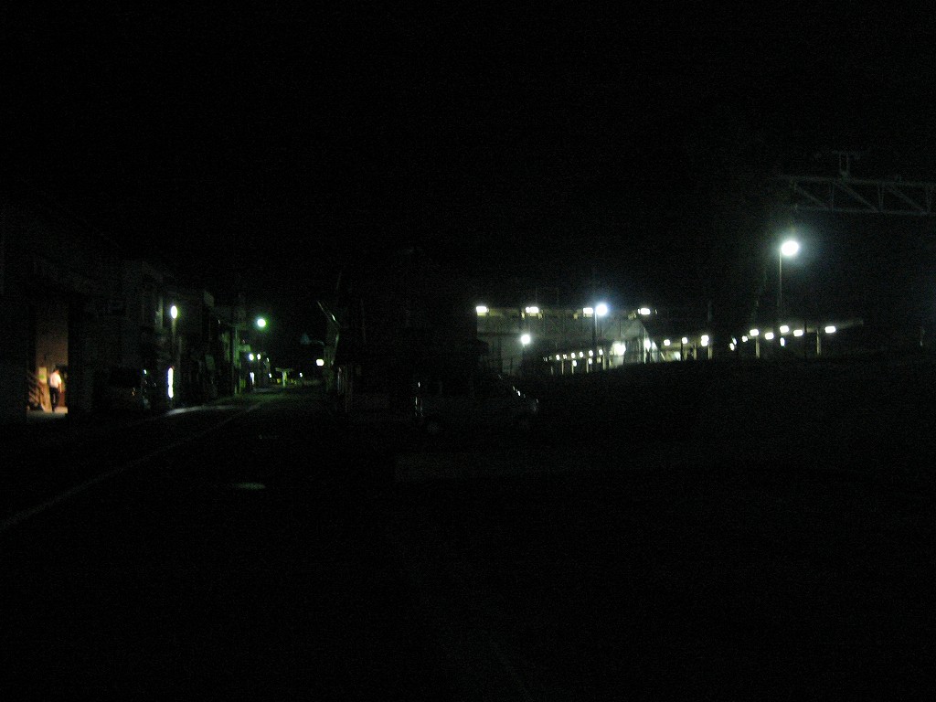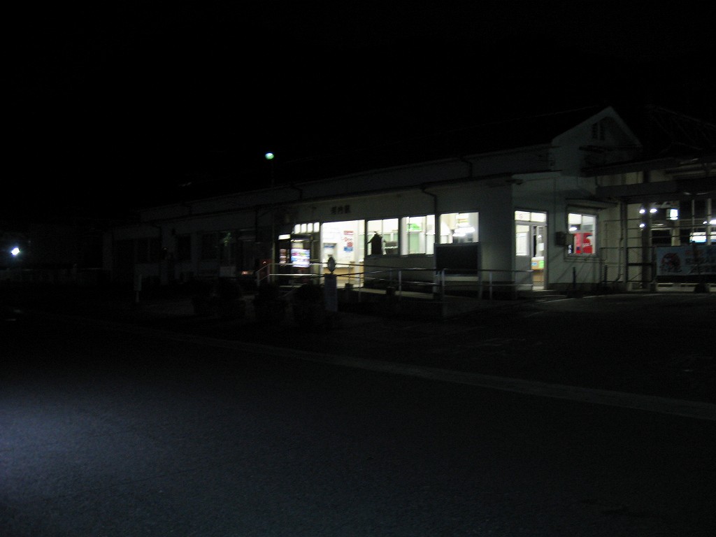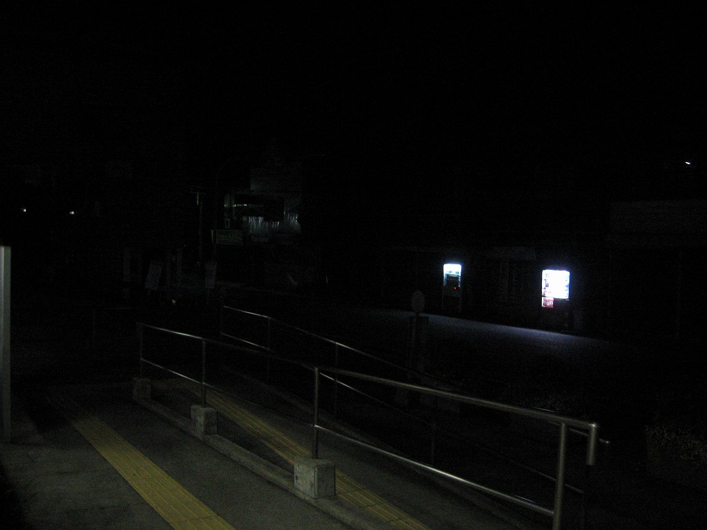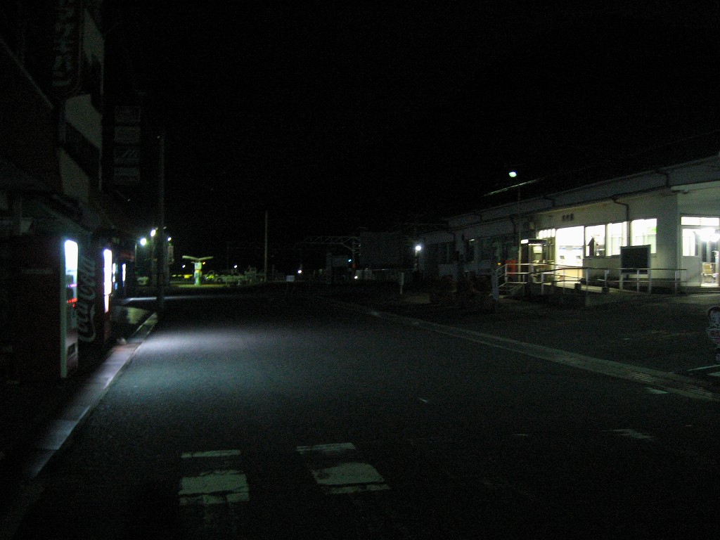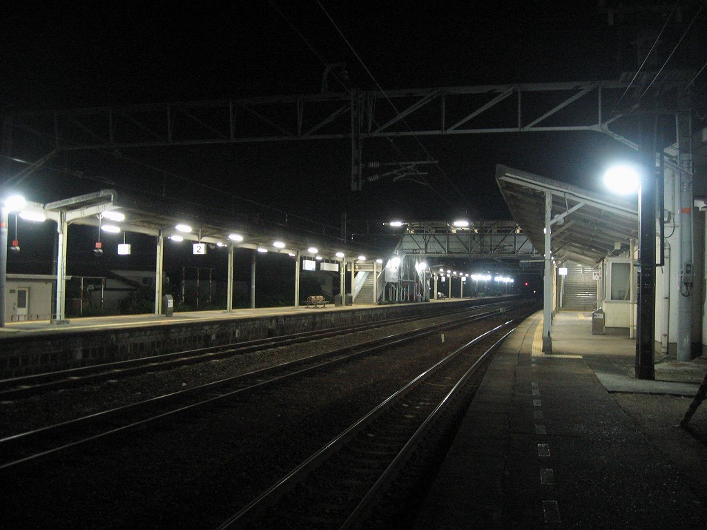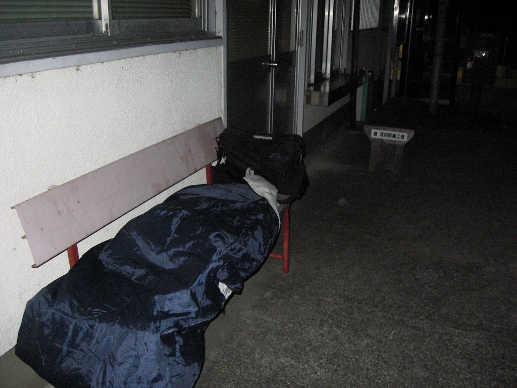 最後の一本前になったとき、僕はこれさえやり過ごせば寝られる! そう思いながら精も根も尽き果てた様相で長椅子に座り果てていた。するとどうだろう、道の方からJRのロゴのある車がヘッドライト灯してやってきた。派手なエンジン音が闇夜を破って、一気ににぎやかになった。がやがやとしゃべりながら出てきた彼らを見て、僕は愕然とした。紀勢線の道成寺駅でのことを思い出していた。あのときは線路の方から保線員がやってきて、そして駅舎の中に入って休憩したのだ。ということは…今回は外の長椅子で寝なくてはならないことになる。