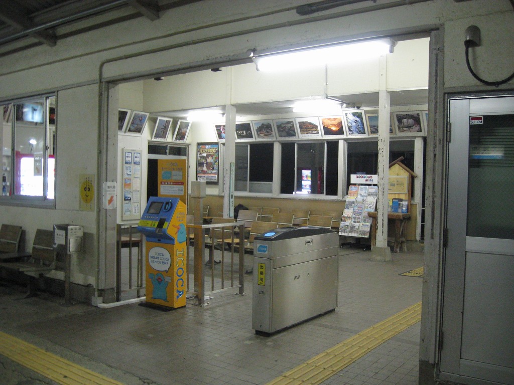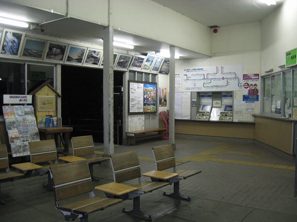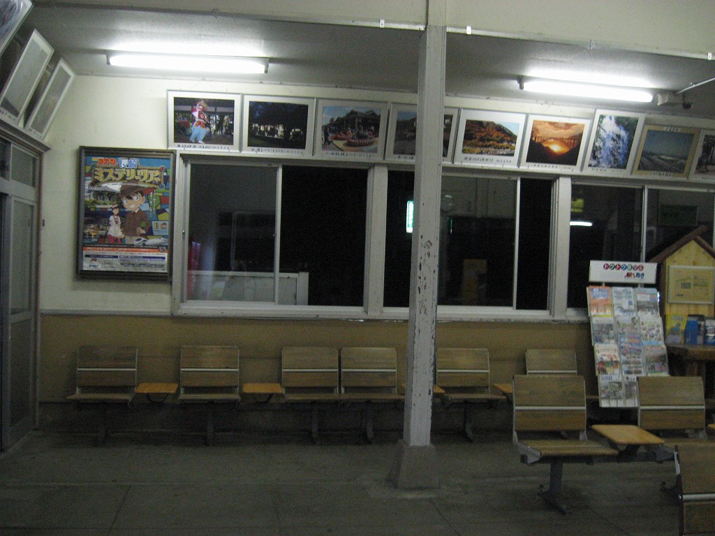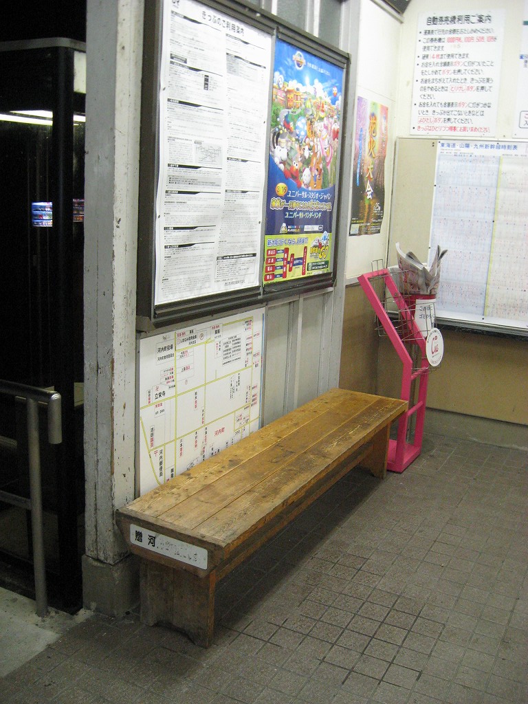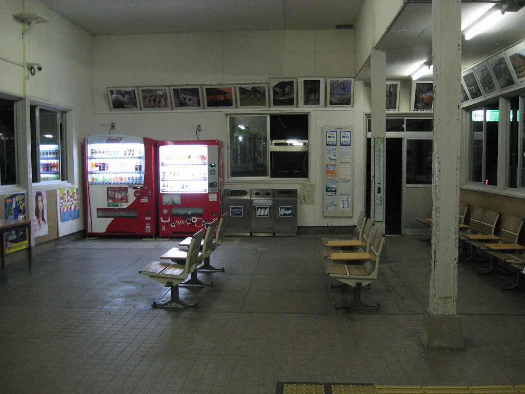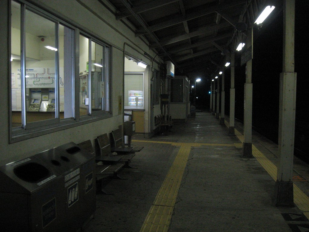 さて、駅舎の中は…と、窺うと、一人掛け椅子ばかりで、やっぱり、と… 一つだけ据え付け長椅子があってここにしようかと思ったけど、駅舎内が明るすぎるのと、出入口に近いので落ち着かない。外に出て周辺を探すと、駅舎の隣の建物の前に、長椅子二脚を発見! ところが人通りはないものの駅舎前なので、こちらも落ち着かない感じである。寝るのはこのどちらかになりそうだ。