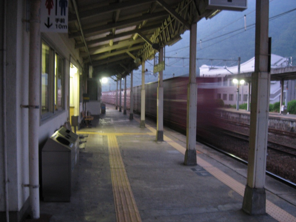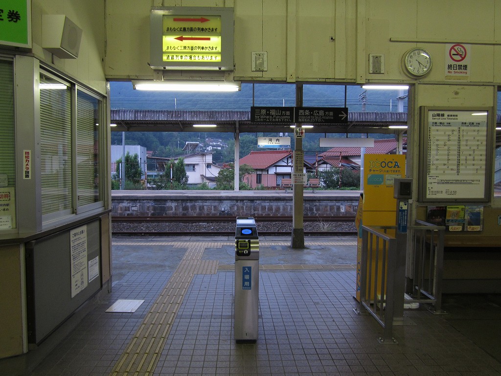 とりあえず水場で身支度を整えて、駅の中や町を巡った。細い道ばかりの山あいの町ながら、店が密で、ふしぎなところだ。しかもここは大幹線、山陽本線である。なんともいえない、山陽の雄渾さを空想できるところだった。始発前は貨物も多い。これから山陽を西に詰めていくならどんだけ楽しいことかと思うけど、僕はもう山陰本線を西に詰めて旅しつづけ、帰る途中なのだ。家のある方向に向かうっていのは、どんなに頑張っても旅にならない。人間がやがて衰えて死ぬように、避けられないことだ。