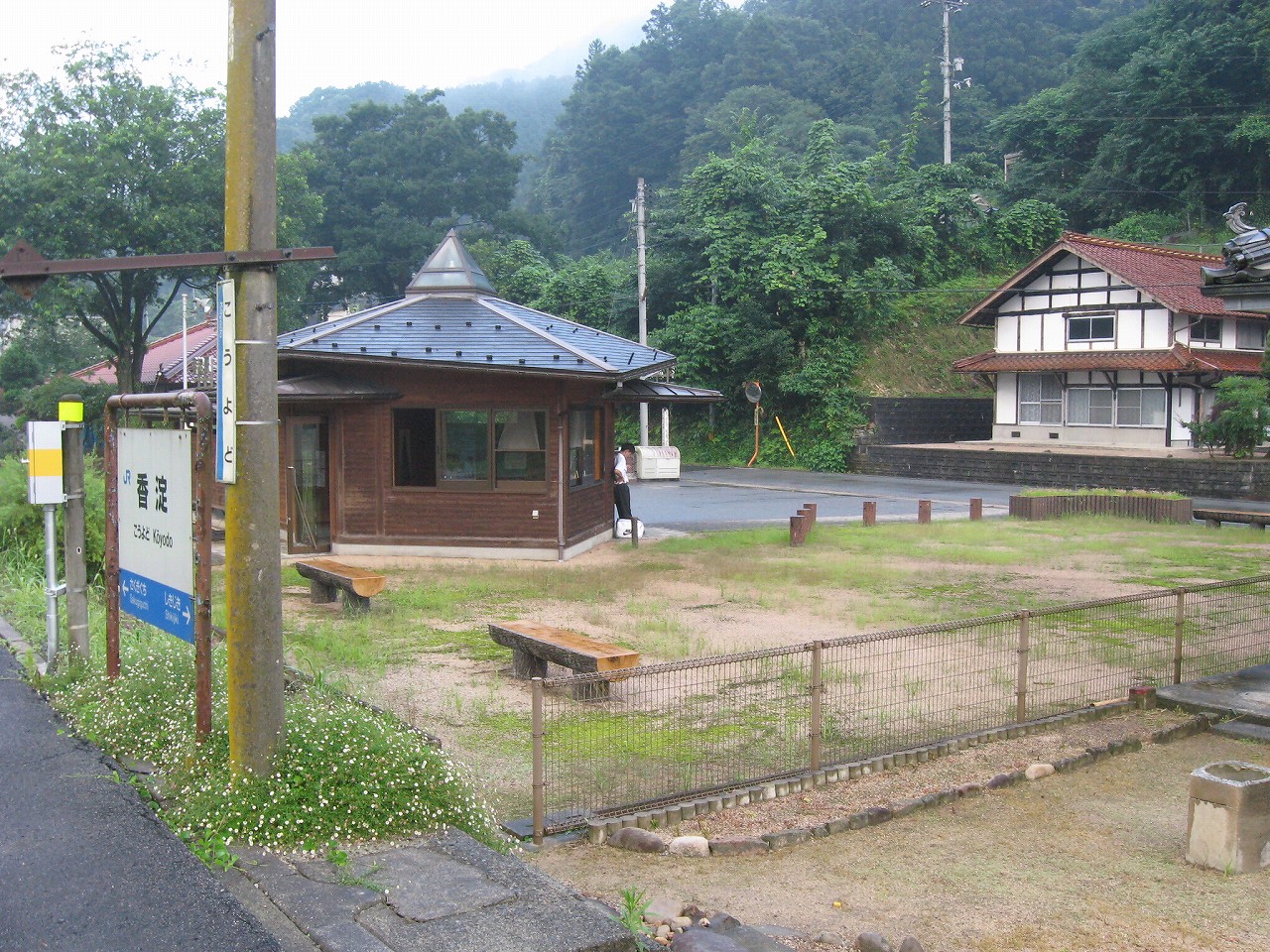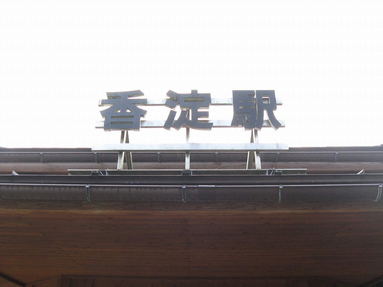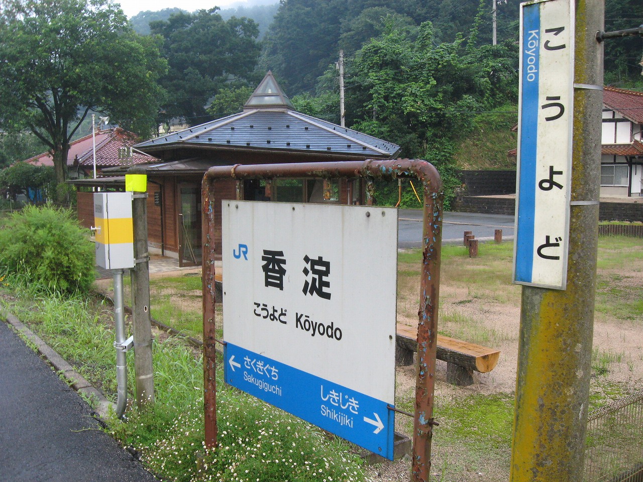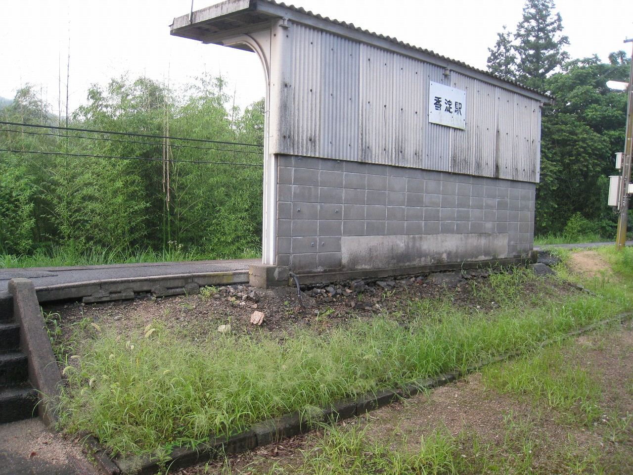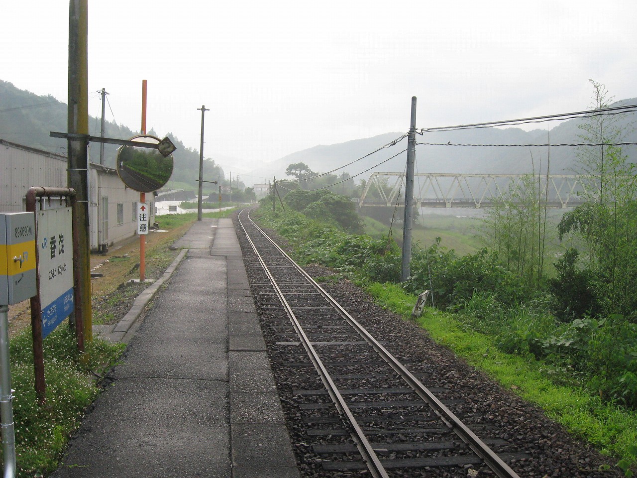 周囲は何軒か家があるが、人も車も通らない、大河の静かな河畔で、どことなく寂しいところだ。三次から来ると、川が惰行し終わったところにあるこの香淀は、もしここに生まれたら、なぜよりによってこんな奥地に生まれついたのだろうと、三次市街へと急ぐ車の中で世を儚んだかもしれない。けれど鉄道乗っているとそんなことを感じさせない。たんたんと平行移動に徹し、川の惰行に沿っていても遠回りに思わせることもなく、名実ともに近代的に市街まで運んでくれる。山を縫いながら運転し、長いトンネルを越えているのとは、何かわけが違う。