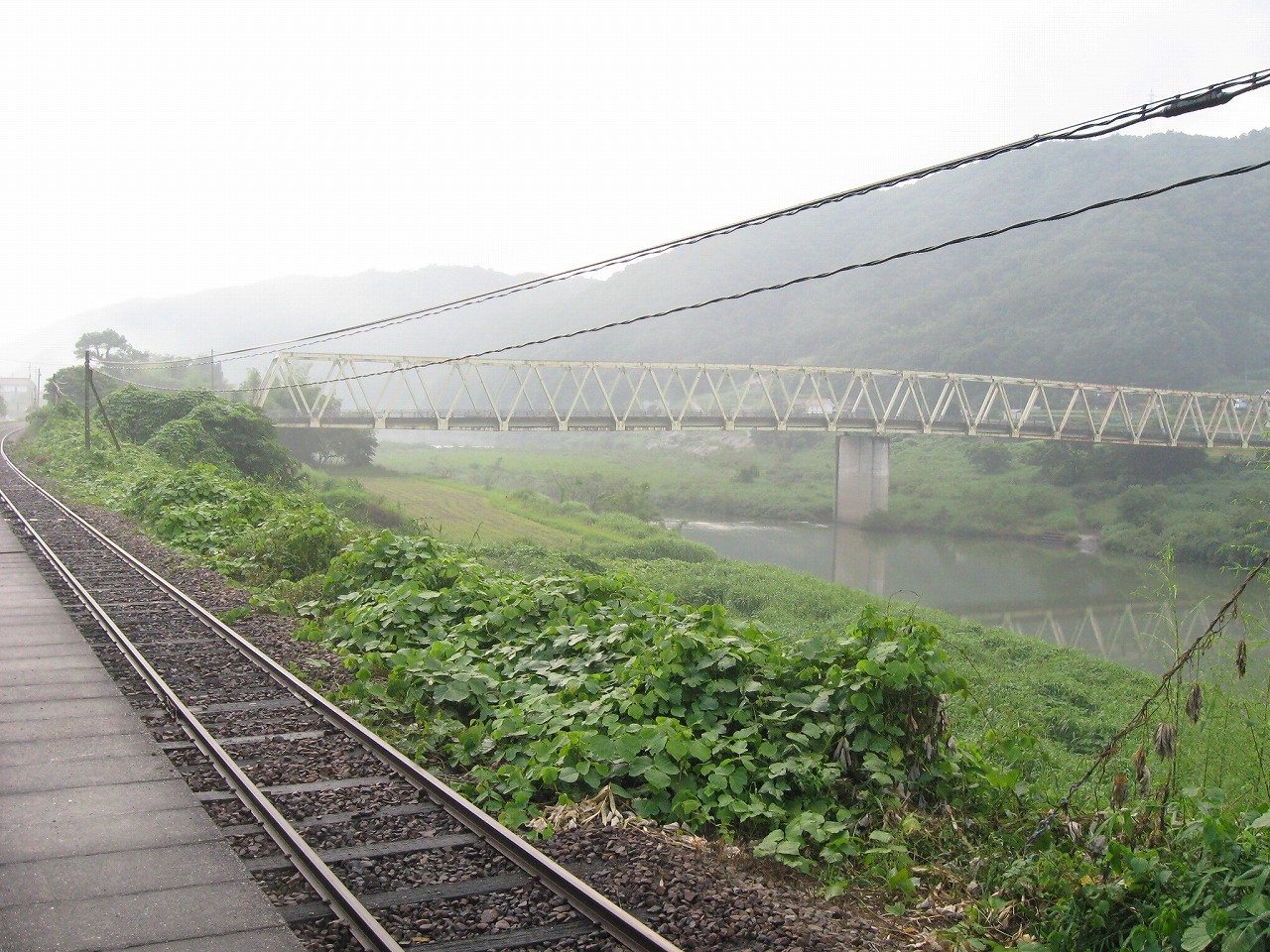 ホームからは江の川とトラス協がよく見て取れた。川に関係する地名があるのも、やはりなと思う。特にここはまさに淀といっていいようなところで、川が川幅の中で自由に流れている。都市部ならそうした河川敷は野球場やテニスコート、ゲートボール場になっているが、ここでは計り知れないほどの緑が、灌木が、竹が、空から人が墜落しても助かるんじゃないかと思えるくらいのもるもるとした分量で、伸びるに任されていた。