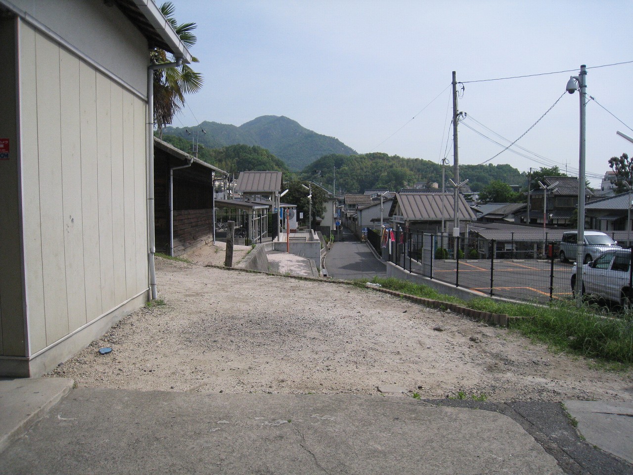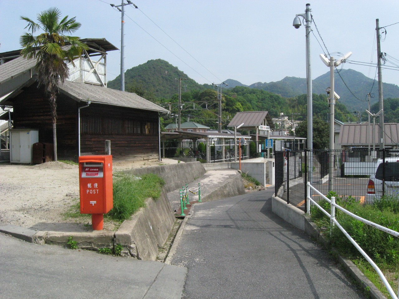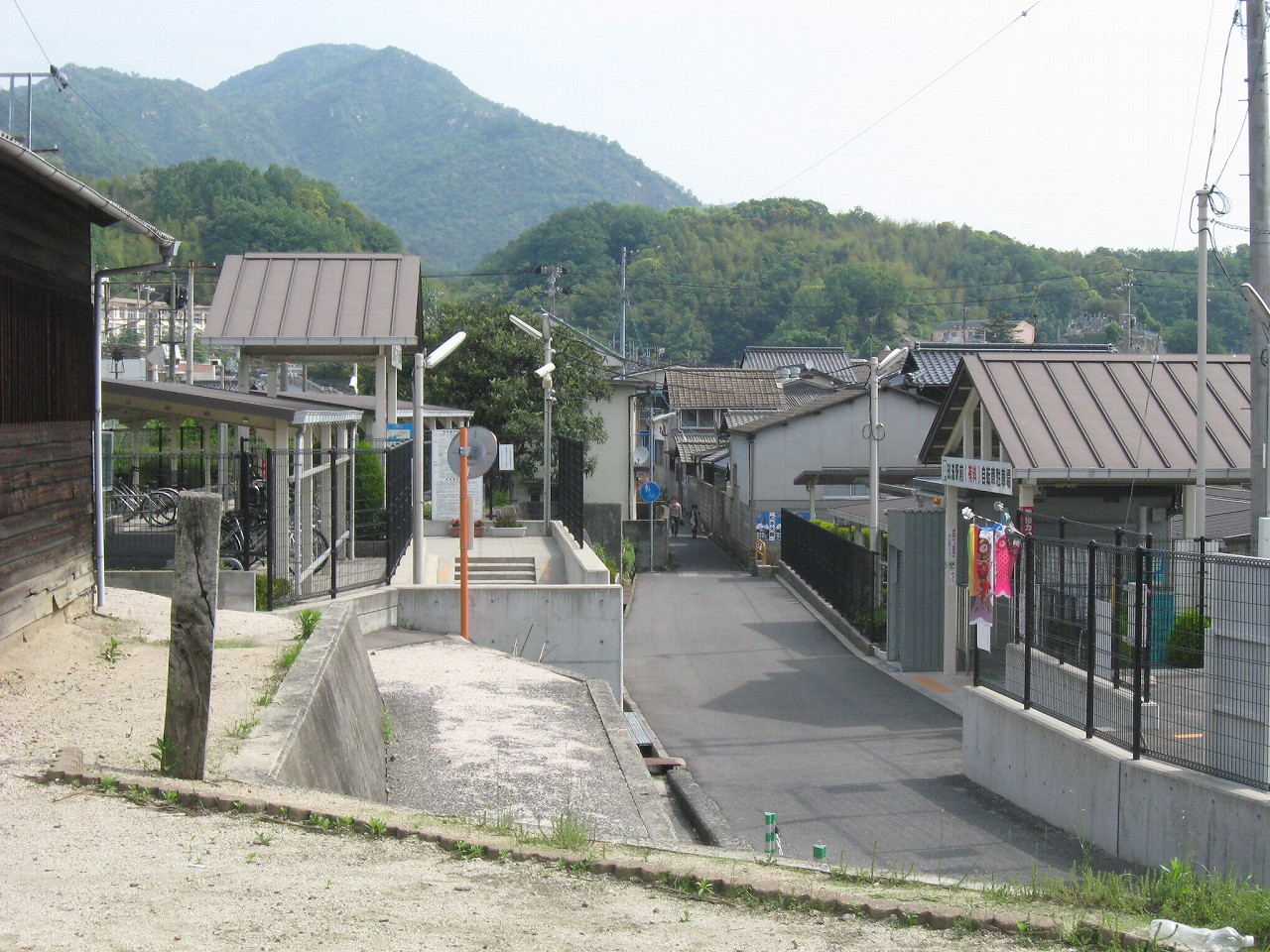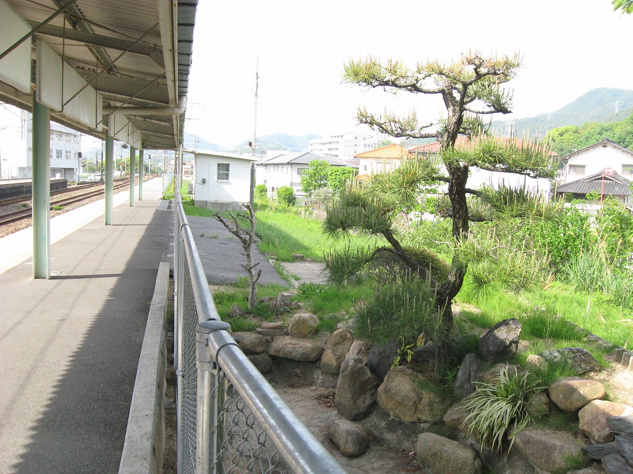 玖波駅から出ると、細道がやって来てここで膨らんでいるという様相。山陽本線によくある懐かし気な構図だ。その細道はなんかわくわく感があり、きっと古い国道につながっている。駅舎は高台で、木柱の哨立するするよく言えばギリシア神殿風だ。花壇や立て看板、歪んだ家などでなんとなくわちゃわちゃした駅前広場を見下ろすと、故郷に帰って来たなぁという感じがする。