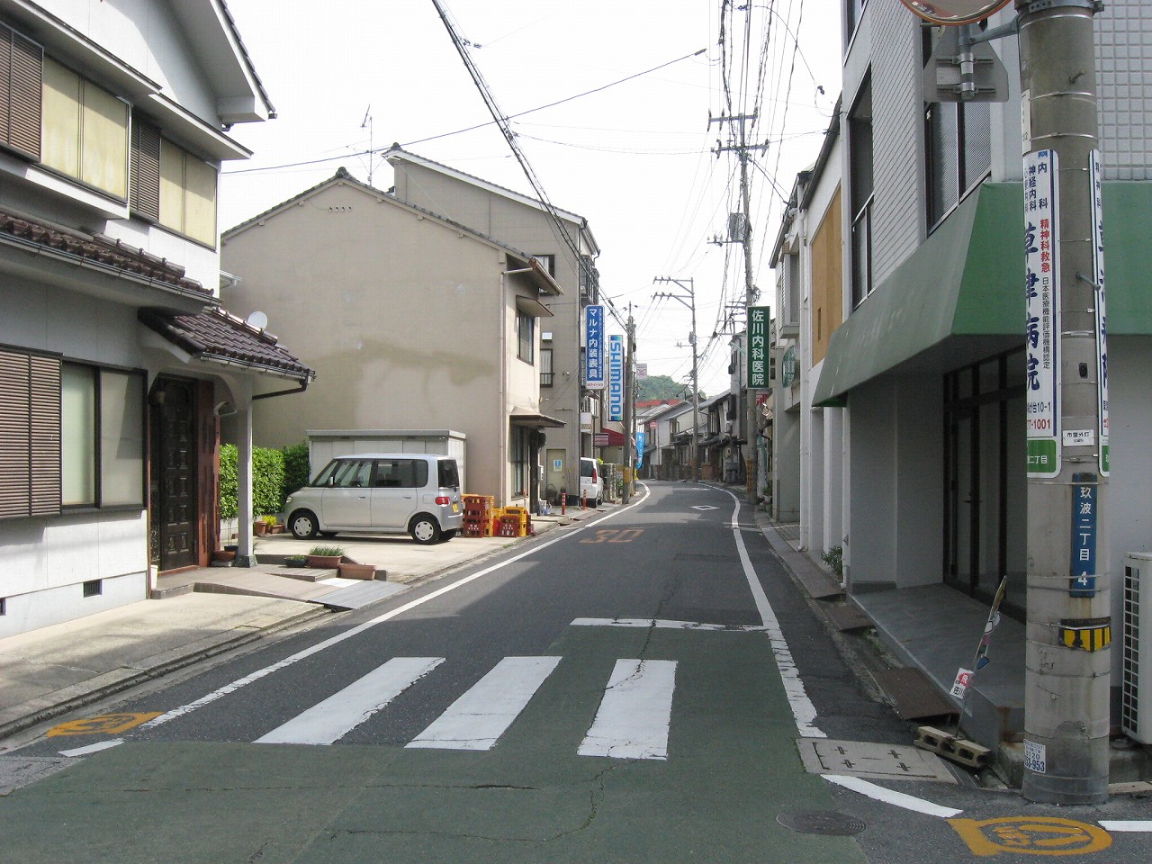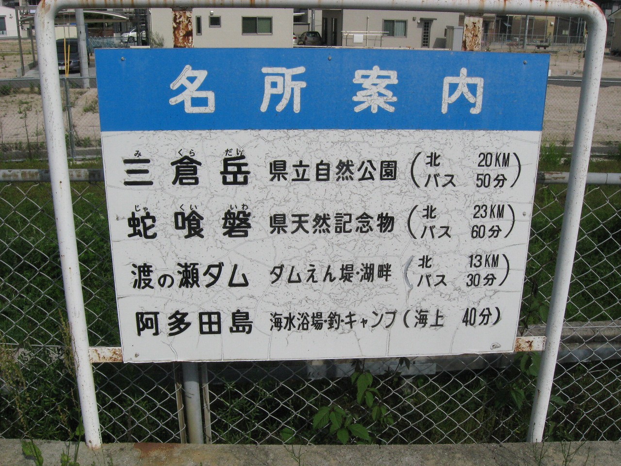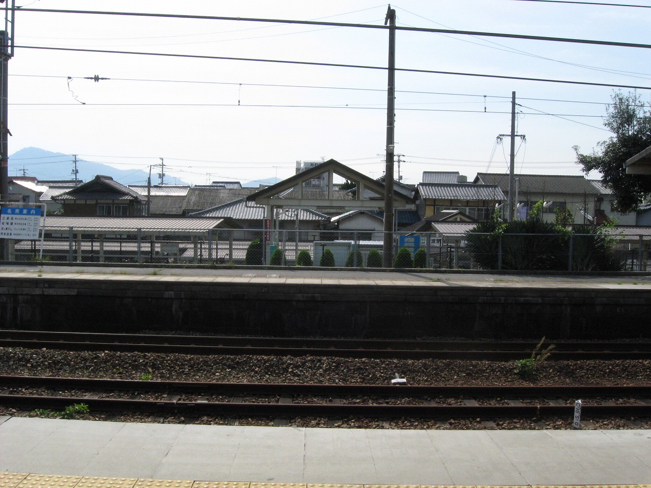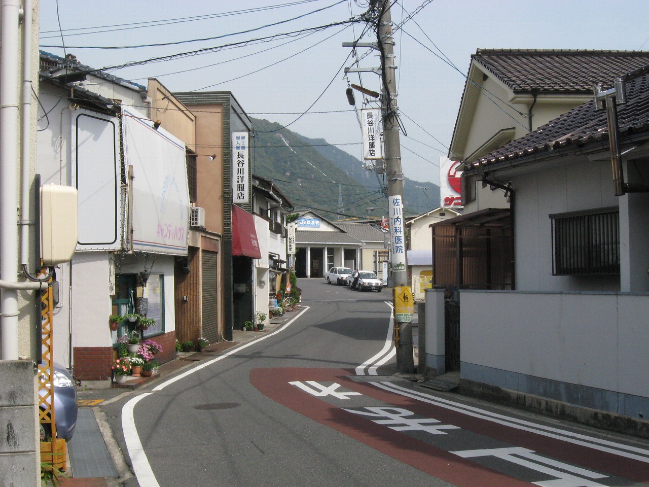 玖波駅から出ると、細道がやって来てここで膨らんでいるという様相。山陽本線によくある懐かし気な構図だ。その細道はなんかわくわく感があり、きっと古い国道につながっている。駅舎は高台で、木柱の哨立するするよく言えばギリシア神殿風だ。花壇や立て看板、歪んだ家などでなんとなくわちゃわちゃした駅前広場を見下ろすと、故郷に帰って来たなぁという感じがする。