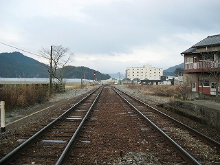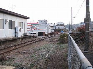 駅舎を右手にして。プレハブ小屋の右手に貨物側線が見えた。