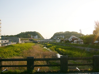 鉄橋のない方向の川を眺めても、 繁茂する河原が続いていて、遊んだらおもしろそうだった。 遠くには真中を開削したような、ふたこぶの山。あの間を名阪国道が通っている。 しかし久米川はあの山を忠実に右に迂回していた。 このふたこぶの山は妙な地形で、お陰で後日、夢に出てきた。 ただでさえ伊賀は山が丘陵で、変わっているのだから。