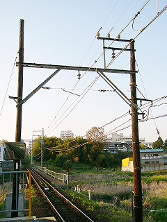列車の行った方を追うと、すぐに小さい鉄橋で、黒い木の架線柱が構えていた。