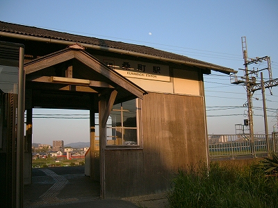 駅へと踵を返した。木造駅舎の空が明るく青ずんで、月が掛かっていた。 いよいよ日も落ちるようだ。入ってきた列車は、これから上野市街に入っていく。 この先、停車間隔も急に短くなり、列車も夕刻のやり甲斐が出そうだった。
