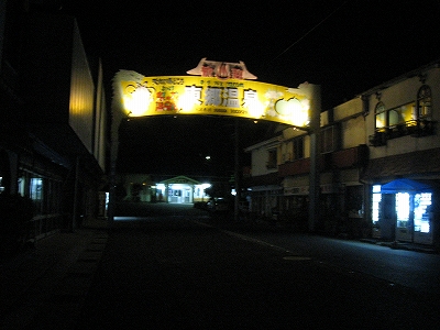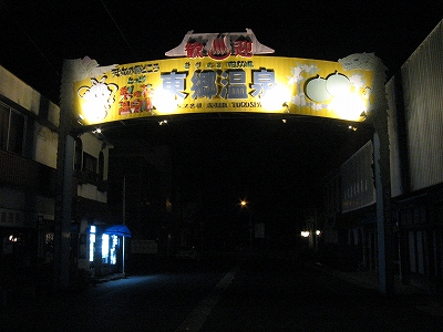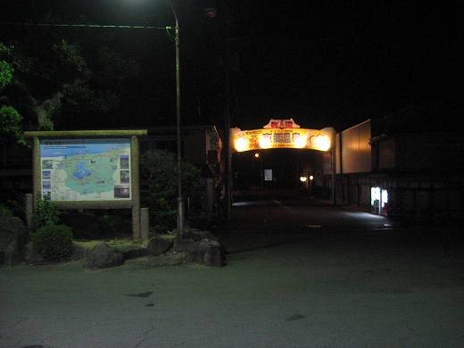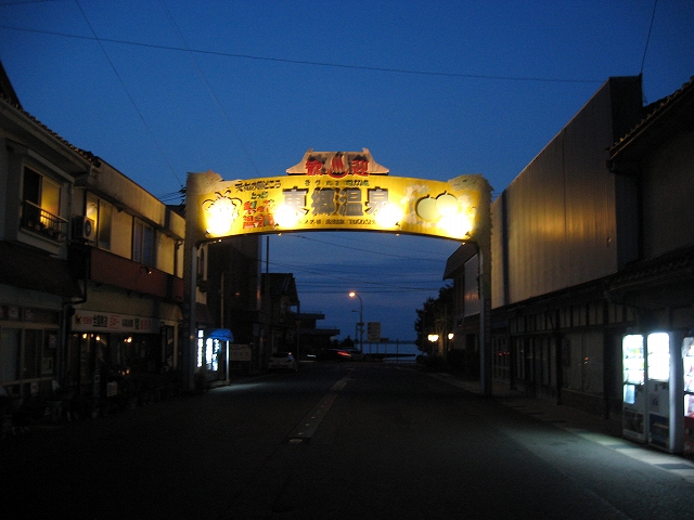 駅の中は白い光の下、水色と白のベンチを静かきれいに並べ、改札窓口はもう暗い。外に出ると蒸しあっつい空気とともに、歓迎アーチの白熱灯がうかび、そのむこうで私をみずうみがいざなう。「来たかったんだよ」と思いつつ、湯梨浜温泉・東湖園へ急ぐため、アーチへは行かず駅出てすぐ左折する。早くいかないと閉まってしまう。