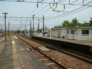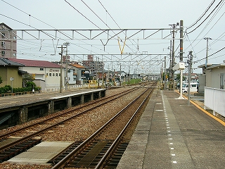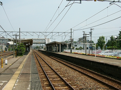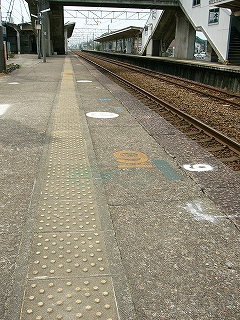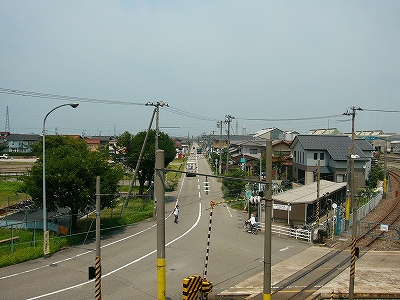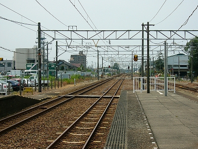駅はやはり特急停車の造りをしているが、特急は通過するものも多いようだ。降り立ったのは駅舎のないホームだった。とにかく暑い。加賀笠間の方が涼しかったぞ、と思ったが、しばらく経ってやっぱり同じだとげんなり断定した。ホームがまた古いコンクリートの床面で、永いあいだ踏み削られてきた様相だった。駅裏のほうを眺めると、田んぼのように見えるところに北陸らしい広告板が並んでいる。けれども静かな道をまあまあ自動車も通っていて、そんなに田舎という感じではない。しかし突然だった。その田んぼのほうから、とても冷たい風が薄い層になって顔に当たってきたのだ。倒れそうなほど気持ちよく、ああ、あの向こうに海があるんだね、と三回ぐらい、心の中でうなずいた。海風だった。