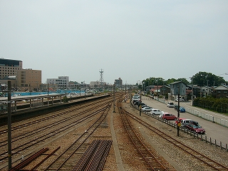ちなまなくてもよいかもしれない。しかしこの跨線橋は長く、裏表を繋いでいた。窓をのぞくと、なんと離れたところにヤードがあり、おもしろげな編成がいっぱい留置されている。「そうか、あれが松任工場なんだ」。初めて見たのだった。