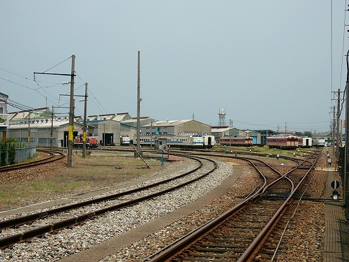 松任工場は西口を出て、細道であることも気にせず直進。塀があるため、見えるか見えないのかとどきまぎしながら近づくと、なんとか見えるようだ。ヤードにはいつもの普通列車の編成のほかに、旧急行色の気動車が午睡している。たぶん、おわら臨で運用されるものだろう。今は8月初旬。おわら風の盆踊りは9月の初めだ。